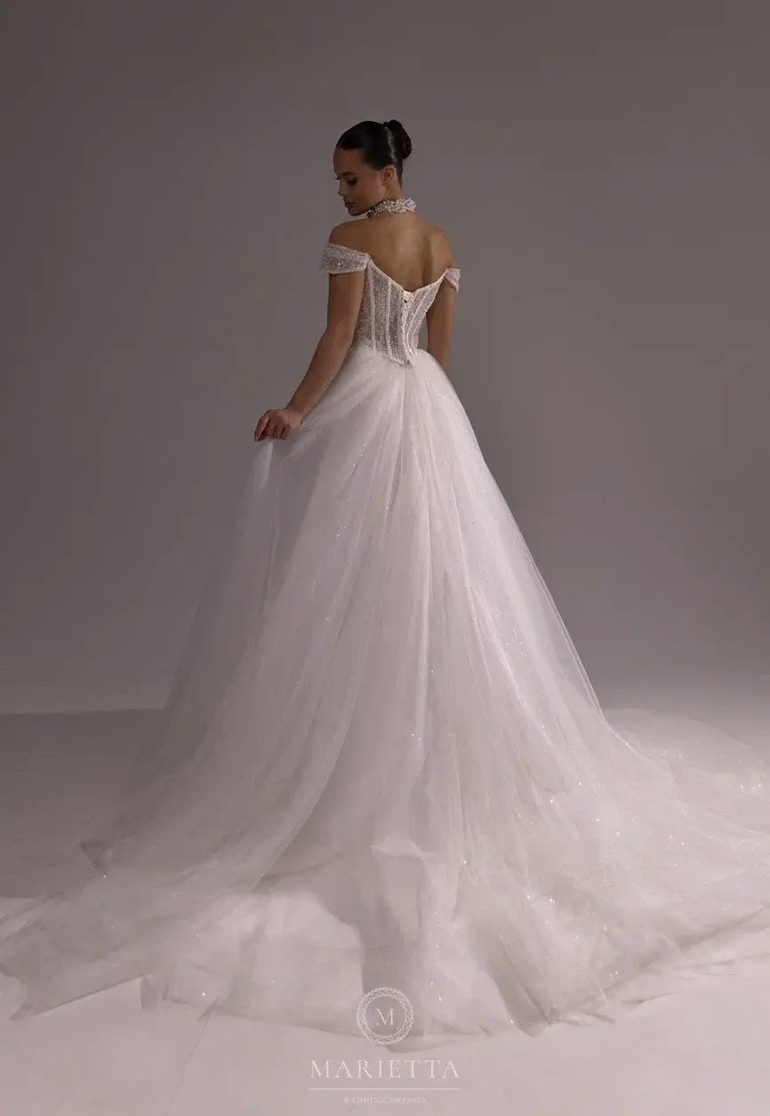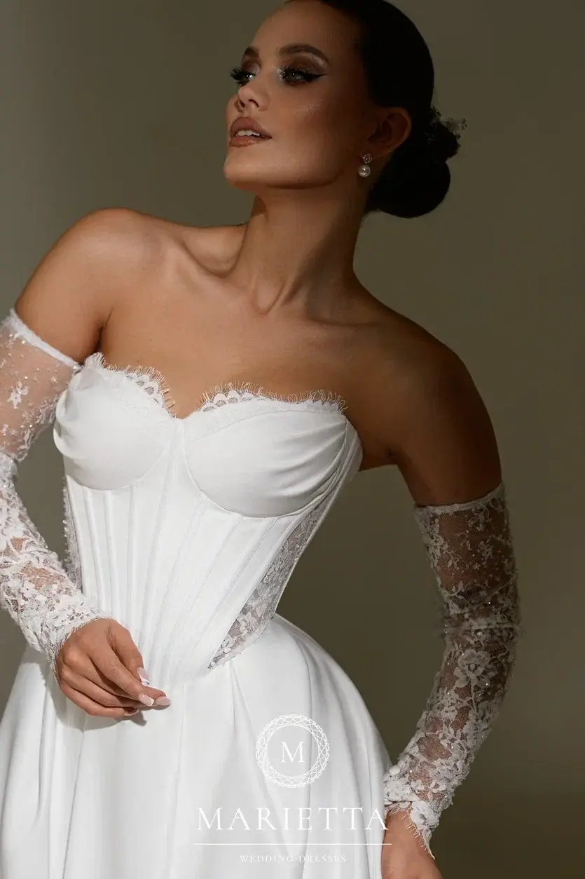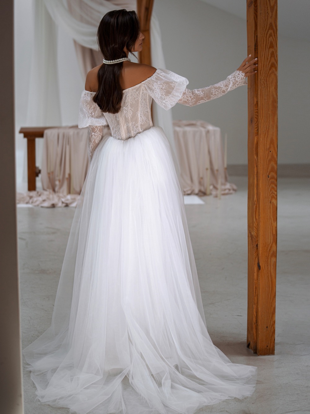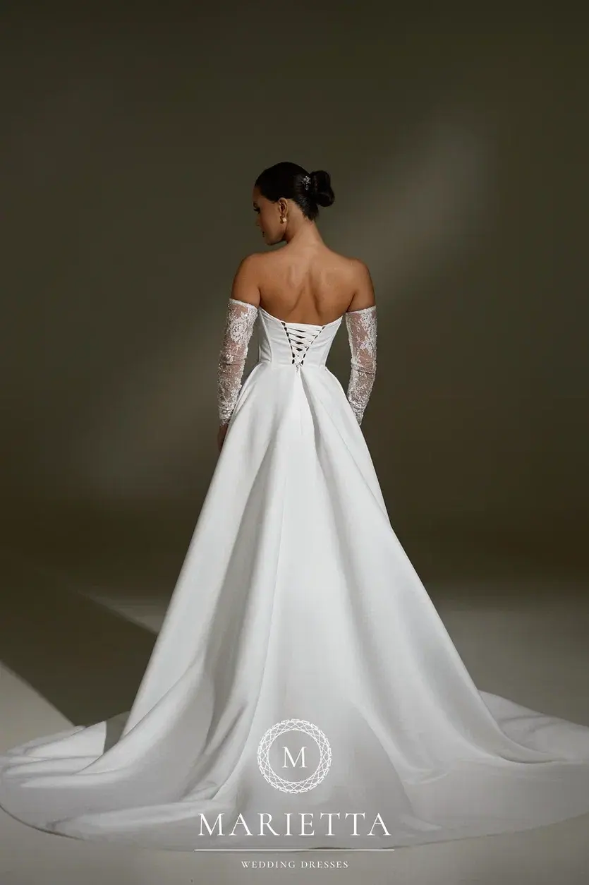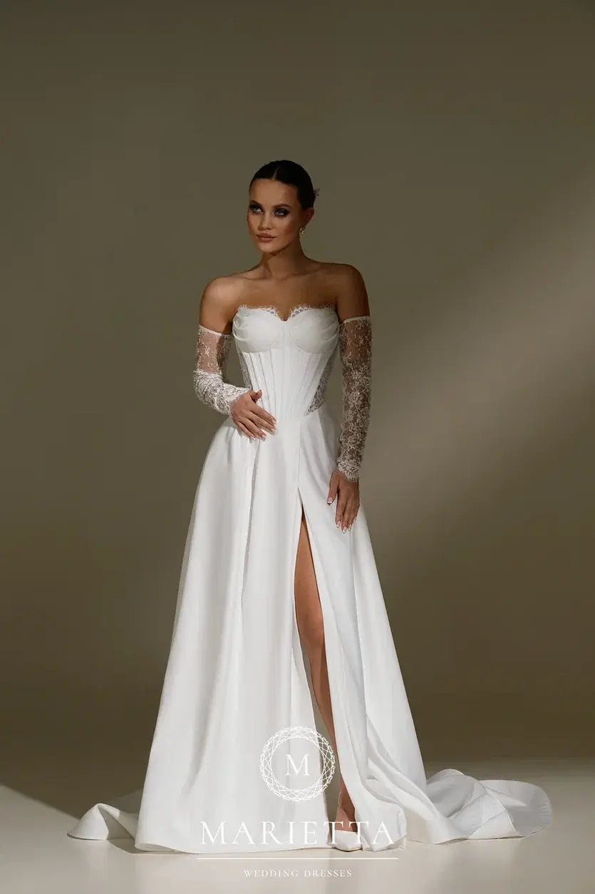 «Dazy» — платье с плотным корсетом, открытым верхом и нежным блеском. Со съемными рукавами. Привлекательность и изящество в одном. Представляем вам «Dazy» — свадебное платье с плотным корсетом, открытым верхом и нежным блеском. Это уникальное платье-трансформер, которое станет настоящим акцентом вашего образа в такой важный день. Одна из главных особенностей этого платья — съемные рукава. Вы можете выбрать, носить ли их или нет, чтобы создать идеальный стиль, который подчеркнет вашу индивидуальность. Корсет сияет блестками, приковывая взгляды окружающих и придающий вашему образу роскошный вид. Простая юбка делает это платье еще более привлекательным для наших невест. Она добавляет легкости и удобства при движении. Маленький шлейф не только создает комфорт при носке и визуально вытягивает силуэт на фото, но и придает вашему образу элегантности и изысканности. Но настоящая магия «Dazy» проявляется при освещении. Нежный блеск платья подчеркнет вашу красоту и привлечет восхищенные взгляды окружающих, будь то вечернее освещение или солнечные лучи. «Dazy» — это не просто свадебное платье, это настоящий образец стиля и изысканности. Вы можете арендовать его в нашем свадебном салоне «Миллениум» и стать настоящей королевой на своей свадьбе.