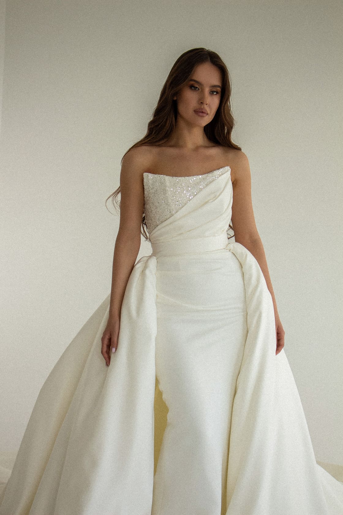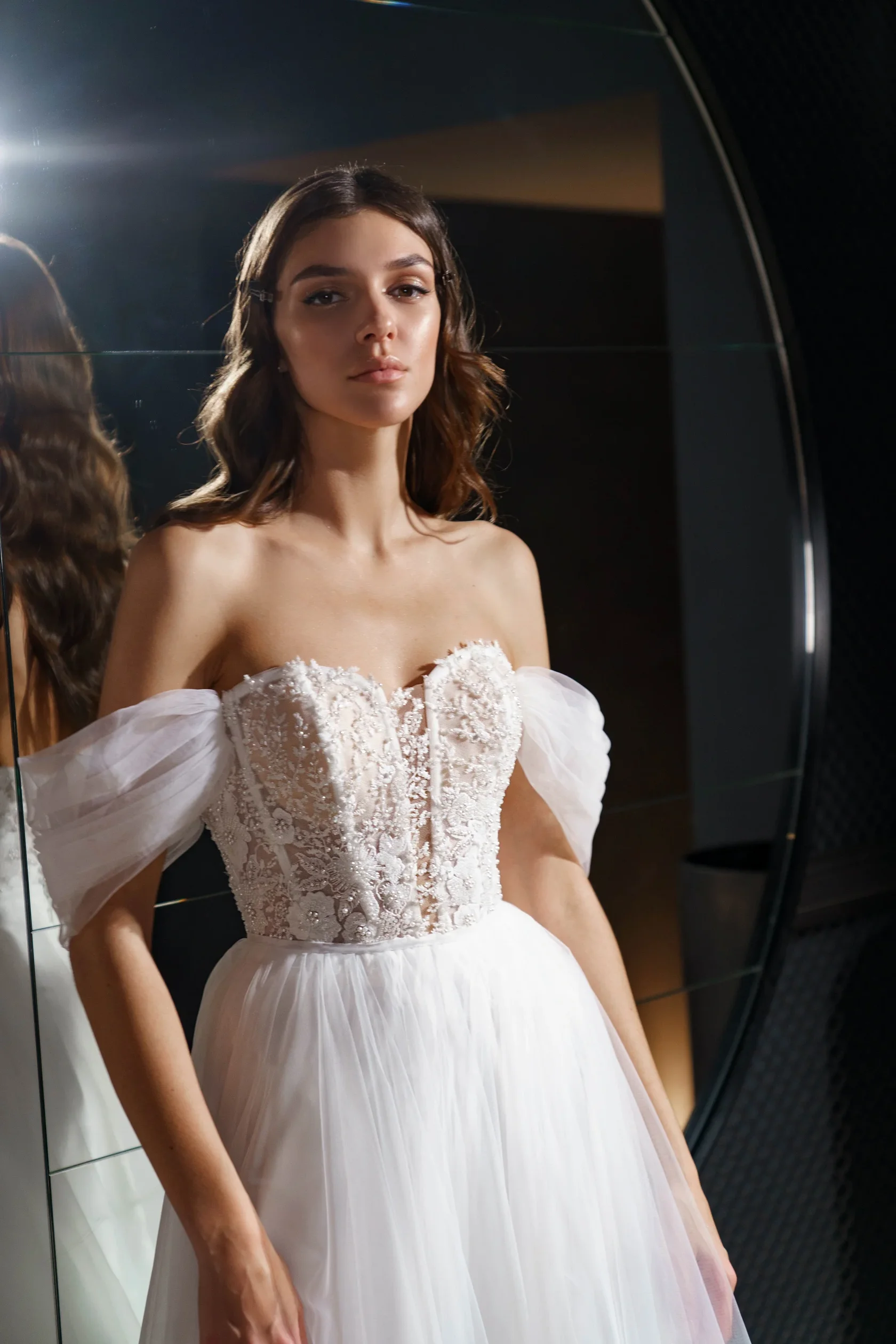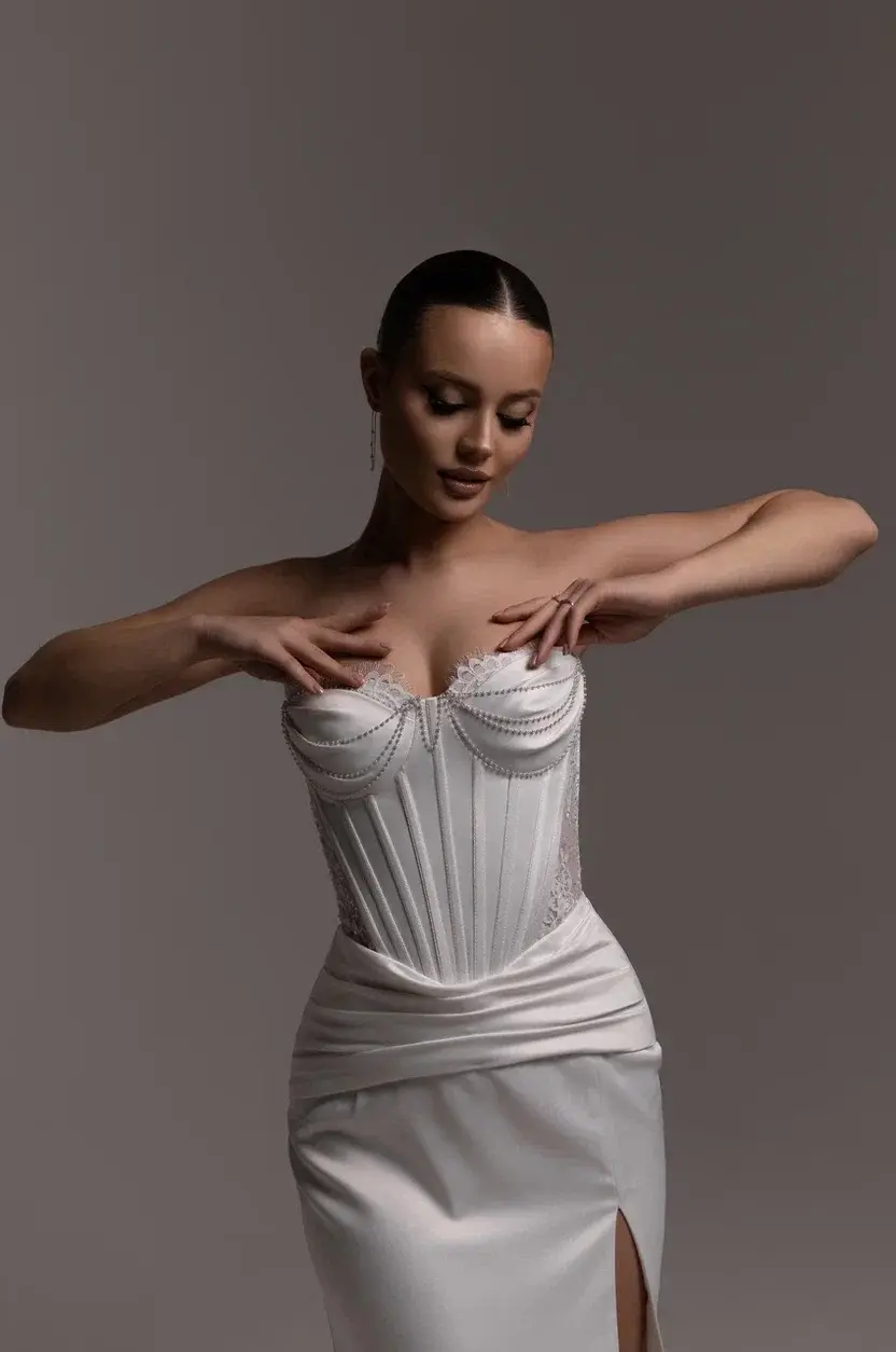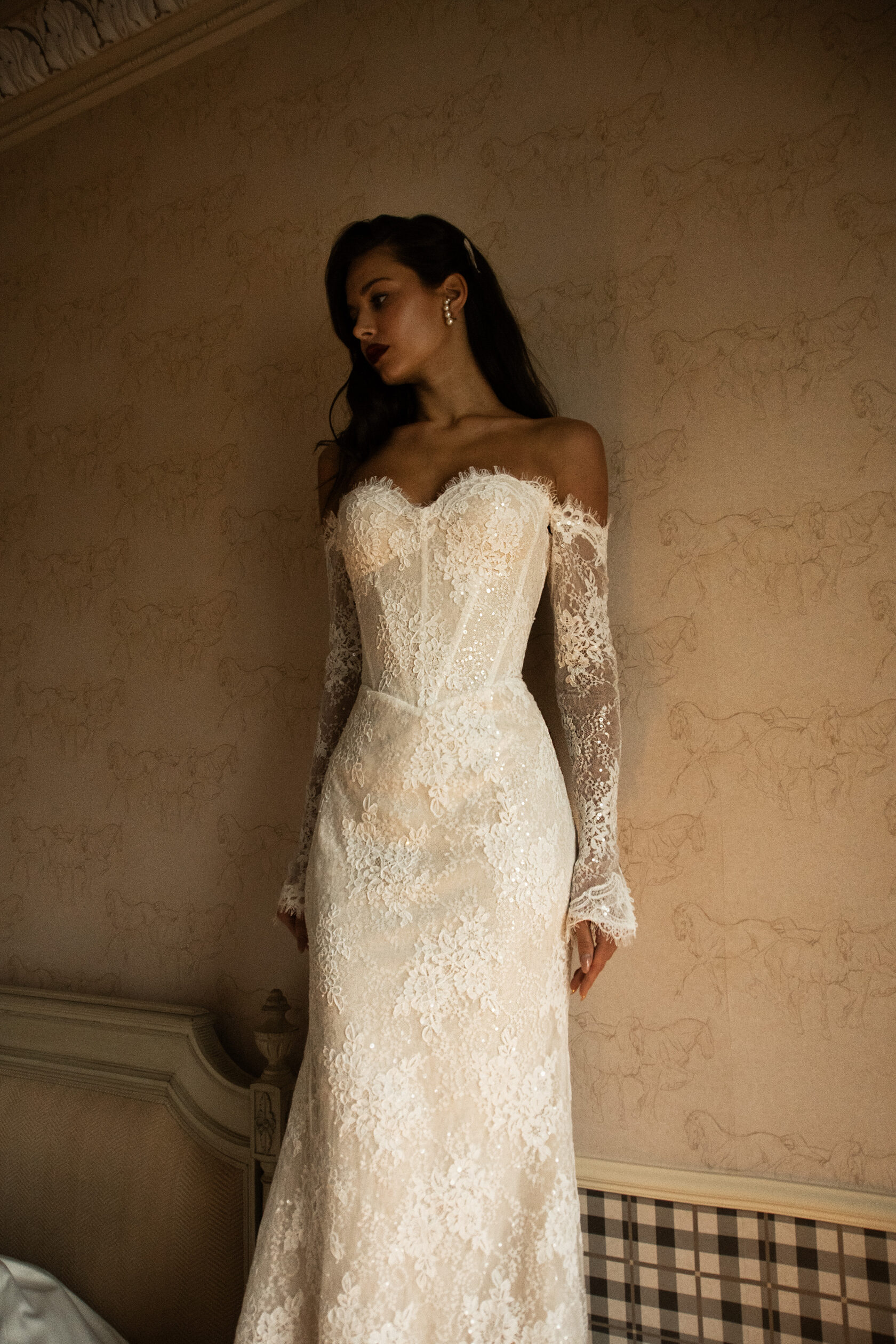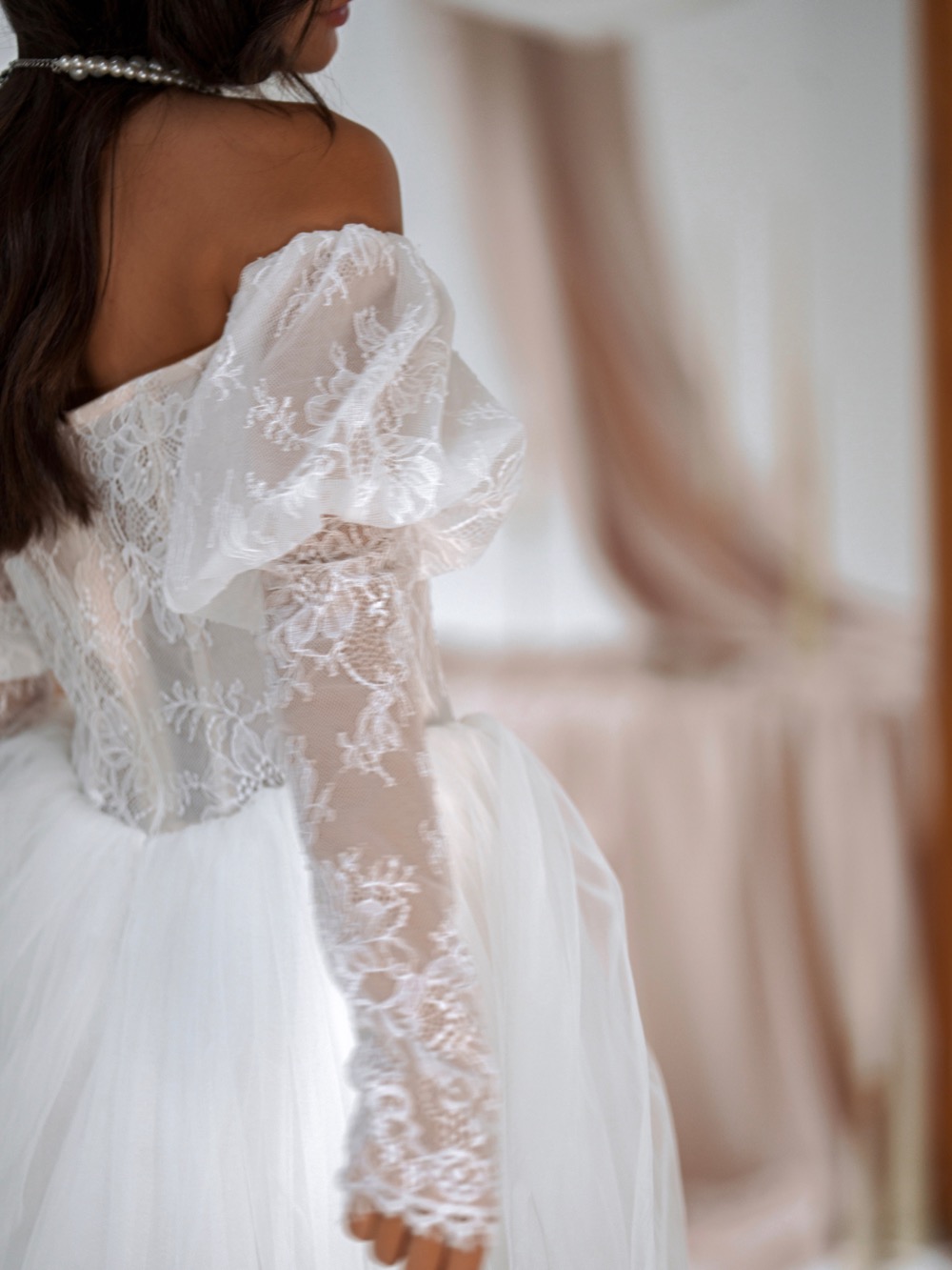 «Dazy» — платье с плотным корсетом, открытым верхом и нежным блеском. Со съемными рукавами. Привлекательность и изящество в одном. Представляем вам «Dazy» — свадебное платье с плотным корсетом, открытым верхом и нежным блеском. Это уникальное платье-трансформер, которое станет настоящим акцентом вашего образа в такой важный день. Одна из главных особенностей этого платья — съемные рукава. Вы можете выбрать, носить ли их или нет, чтобы создать идеальный стиль, который подчеркнет вашу индивидуальность. Корсет сияет блестками, приковывая взгляды окружающих и придающий вашему образу роскошный вид. Простая юбка делает это платье еще более привлекательным для наших невест. Она добавляет легкости и удобства при движении. Маленький шлейф не только создает комфорт при носке и визуально вытягивает силуэт на фото, но и придает вашему образу элегантности и изысканности. Но настоящая магия «Dazy» проявляется при освещении. Нежный блеск платья подчеркнет вашу красоту и привлечет восхищенные взгляды окружающих, будь то вечернее освещение или солнечные лучи. «Dazy» — это не просто свадебное платье, это настоящий образец стиля и изысканности. Вы можете арендовать его в нашем свадебном салоне «Миллениум» и стать настоящей королевой на своей свадьбе.
