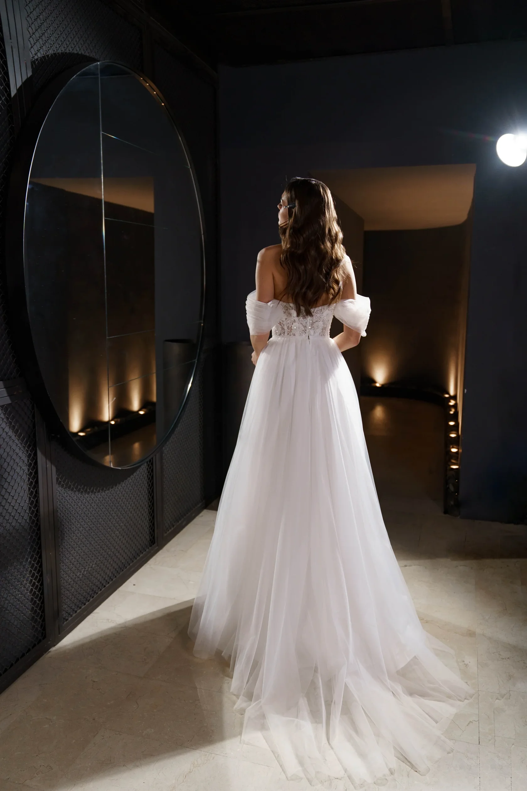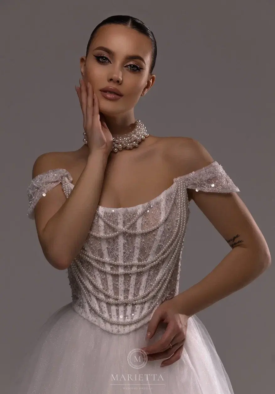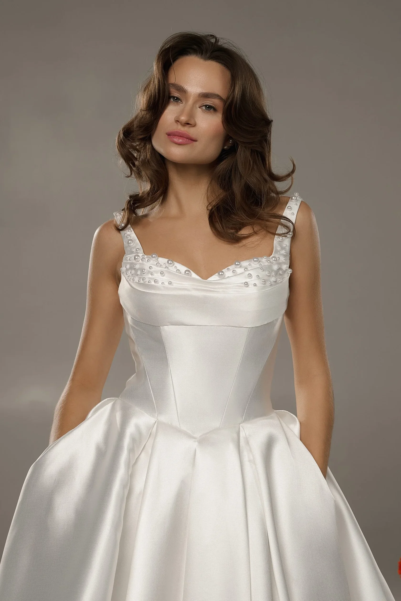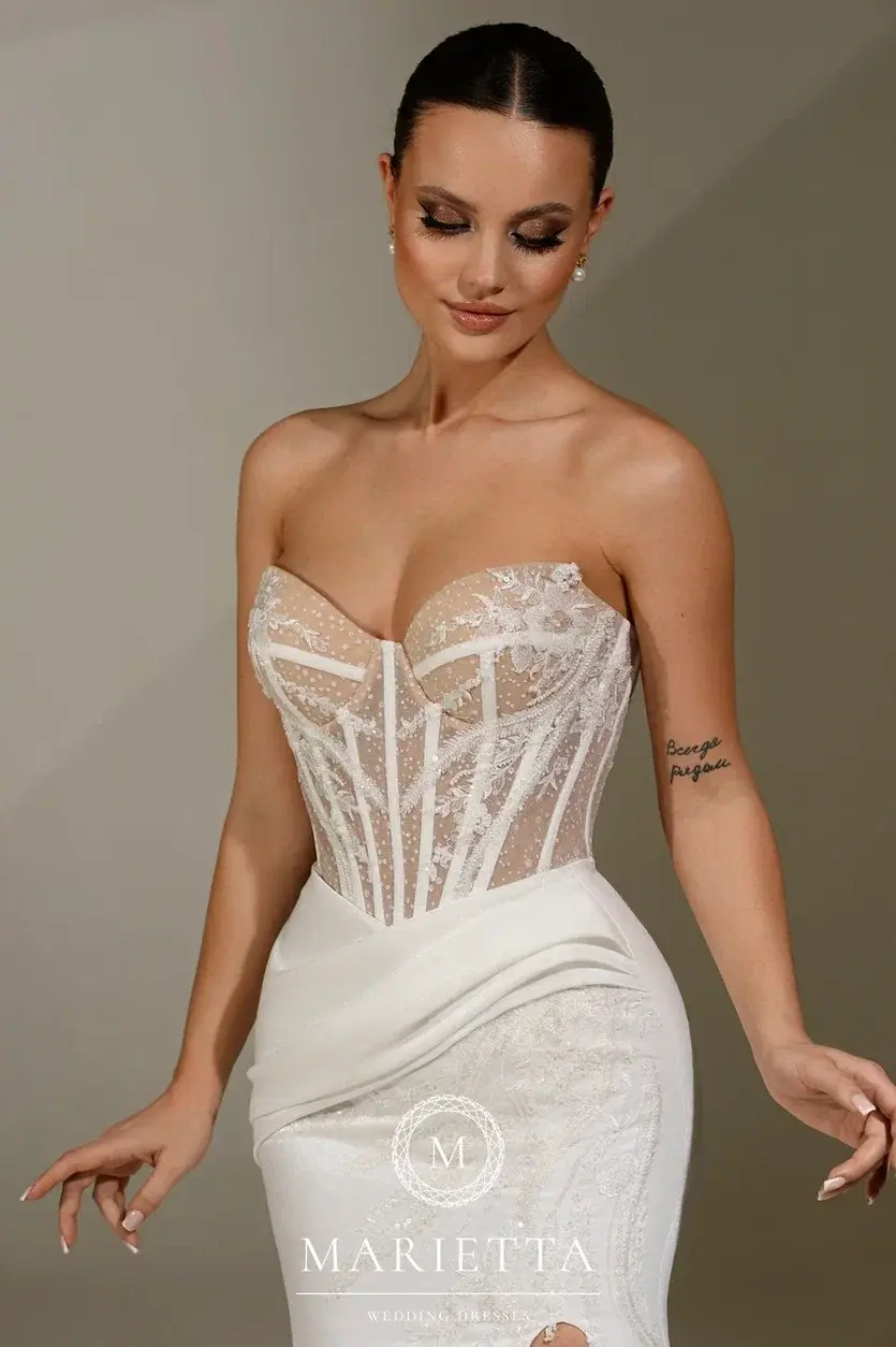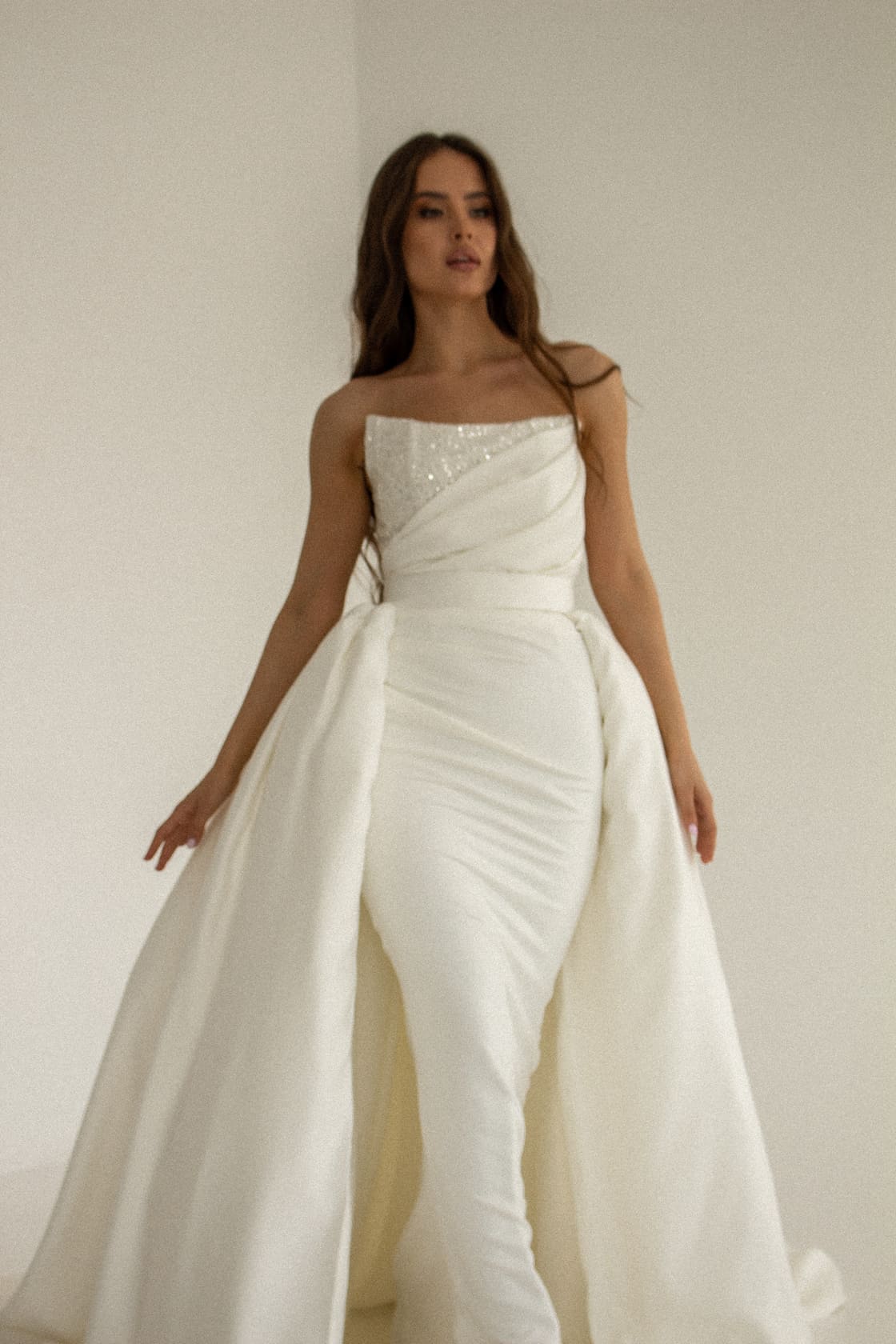 «Dazy» — платье с плотным корсетом, открытым верхом и нежным блеском. Со съемными рукавами. Привлекательность и изящество в одном. Представляем вам «Dazy» — свадебное платье с плотным корсетом, открытым верхом и нежным блеском. Это уникальное платье-трансформер, которое станет настоящим акцентом вашего образа в такой важный день. Одна из главных особенностей этого платья — съемные рукава. Вы можете выбрать, носить ли их или нет, чтобы создать идеальный стиль, который подчеркнет вашу индивидуальность. Корсет сияет блестками, приковывая взгляды окружающих и придающий вашему образу роскошный вид. Простая юбка делает это платье еще более привлекательным для наших невест. Она добавляет легкости и удобства при движении. Маленький шлейф не только создает комфорт при носке и визуально вытягивает силуэт на фото, но и придает вашему образу элегантности и изысканности. Но настоящая магия «Dazy» проявляется при освещении. Нежный блеск платья подчеркнет вашу красоту и привлечет восхищенные взгляды окружающих, будь то вечернее освещение или солнечные лучи. «Dazy» — это не просто свадебное платье, это настоящий образец стиля и изысканности. Вы можете арендовать его в нашем свадебном салоне «Миллениум» и стать настоящей королевой на своей свадьбе.