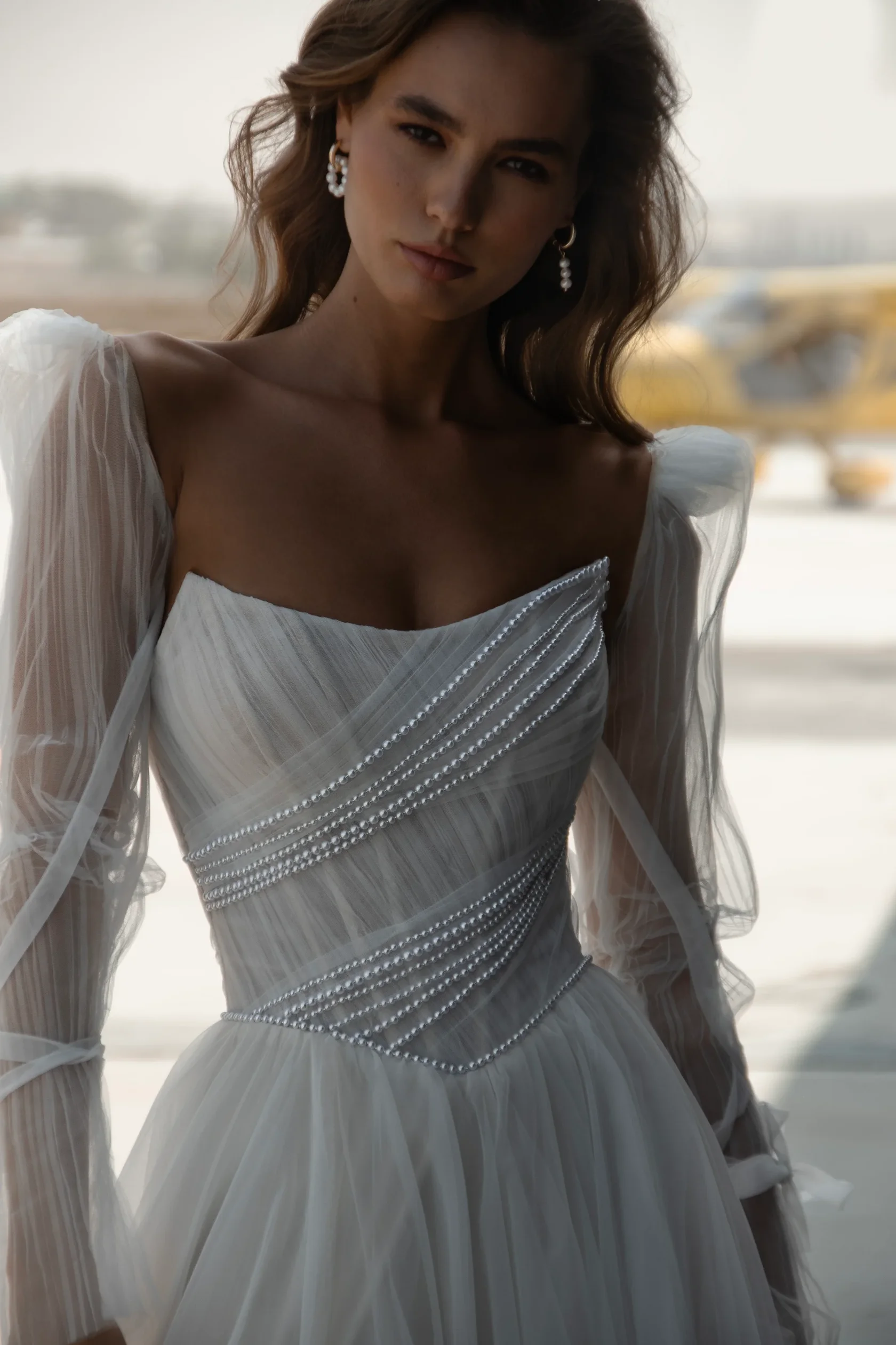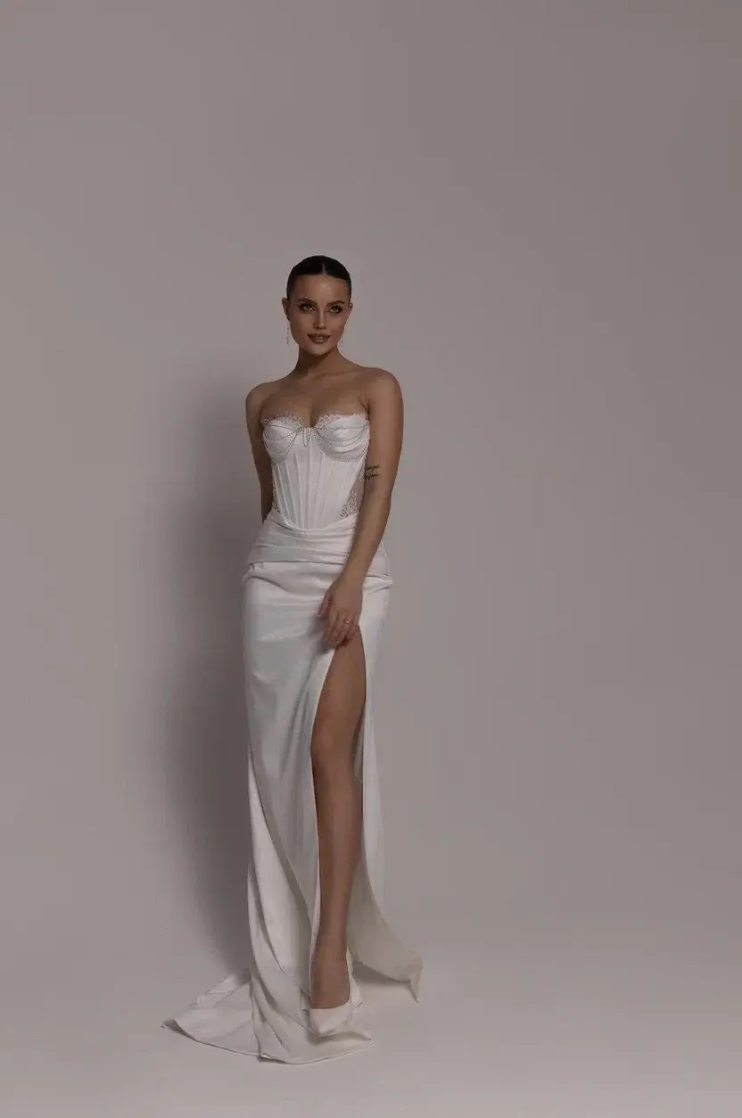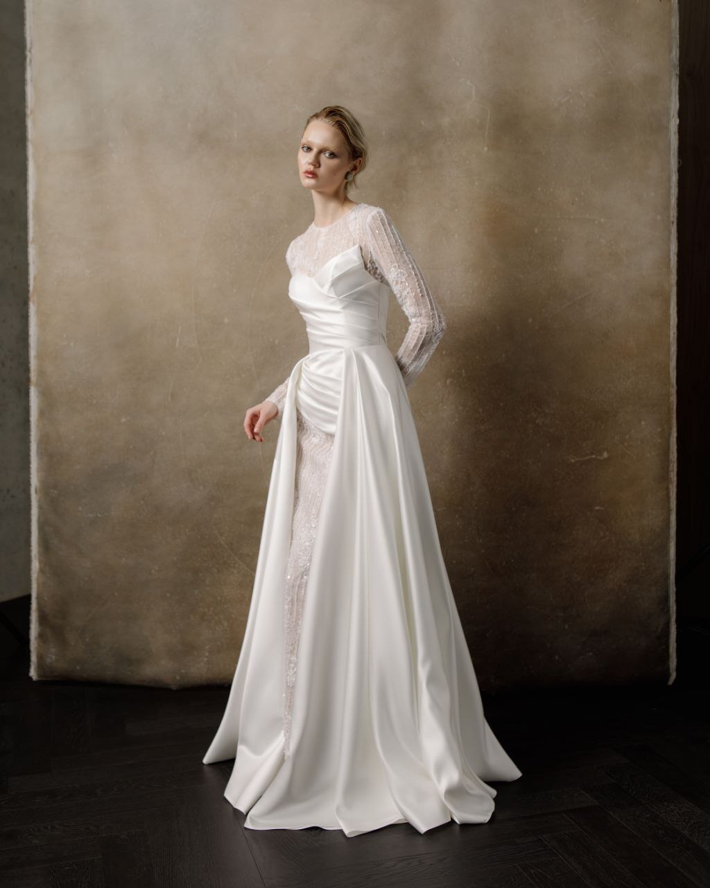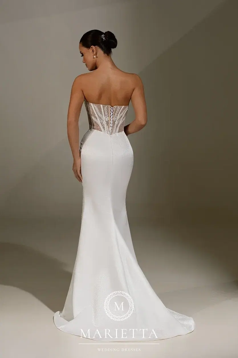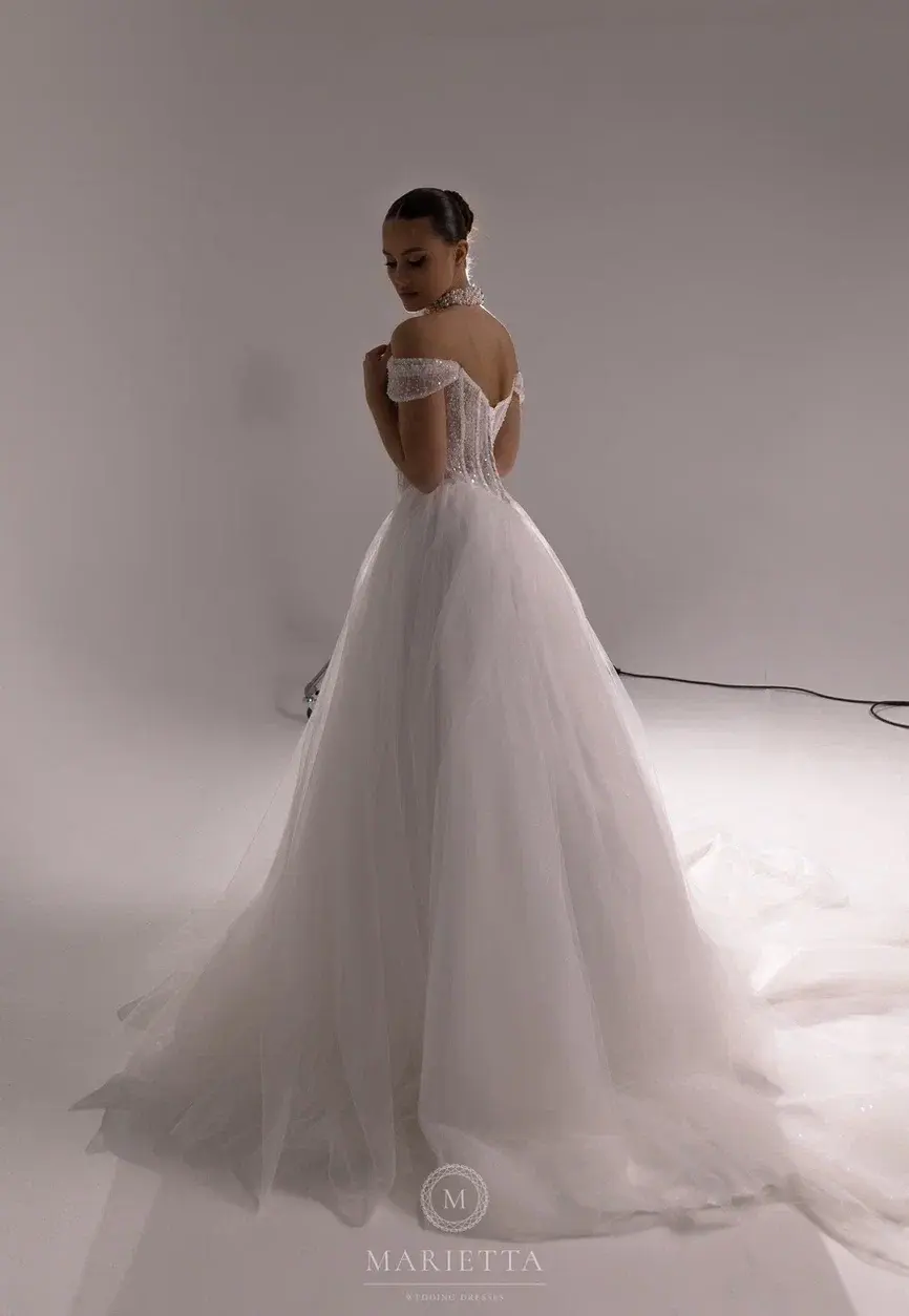 «Dazy» — платье с плотным корсетом, открытым верхом и нежным блеском. Со съемными рукавами. Привлекательность и изящество в одном. Представляем вам «Dazy» — свадебное платье с плотным корсетом, открытым верхом и нежным блеском. Это уникальное платье-трансформер, которое станет настоящим акцентом вашего образа в такой важный день. Одна из главных особенностей этого платья — съемные рукава. Вы можете выбрать, носить ли их или нет, чтобы создать идеальный стиль, который подчеркнет вашу индивидуальность. Корсет сияет блестками, приковывая взгляды окружающих и придающий вашему образу роскошный вид. Простая юбка делает это платье еще более привлекательным для наших невест. Она добавляет легкости и удобства при движении. Маленький шлейф не только создает комфорт при носке и визуально вытягивает силуэт на фото, но и придает вашему образу элегантности и изысканности. Но настоящая магия «Dazy» проявляется при освещении. Нежный блеск платья подчеркнет вашу красоту и привлечет восхищенные взгляды окружающих, будь то вечернее освещение или солнечные лучи. «Dazy» — это не просто свадебное платье, это настоящий образец стиля и изысканности. Вы можете арендовать его в нашем свадебном салоне «Миллениум» и стать настоящей королевой на своей свадьбе.