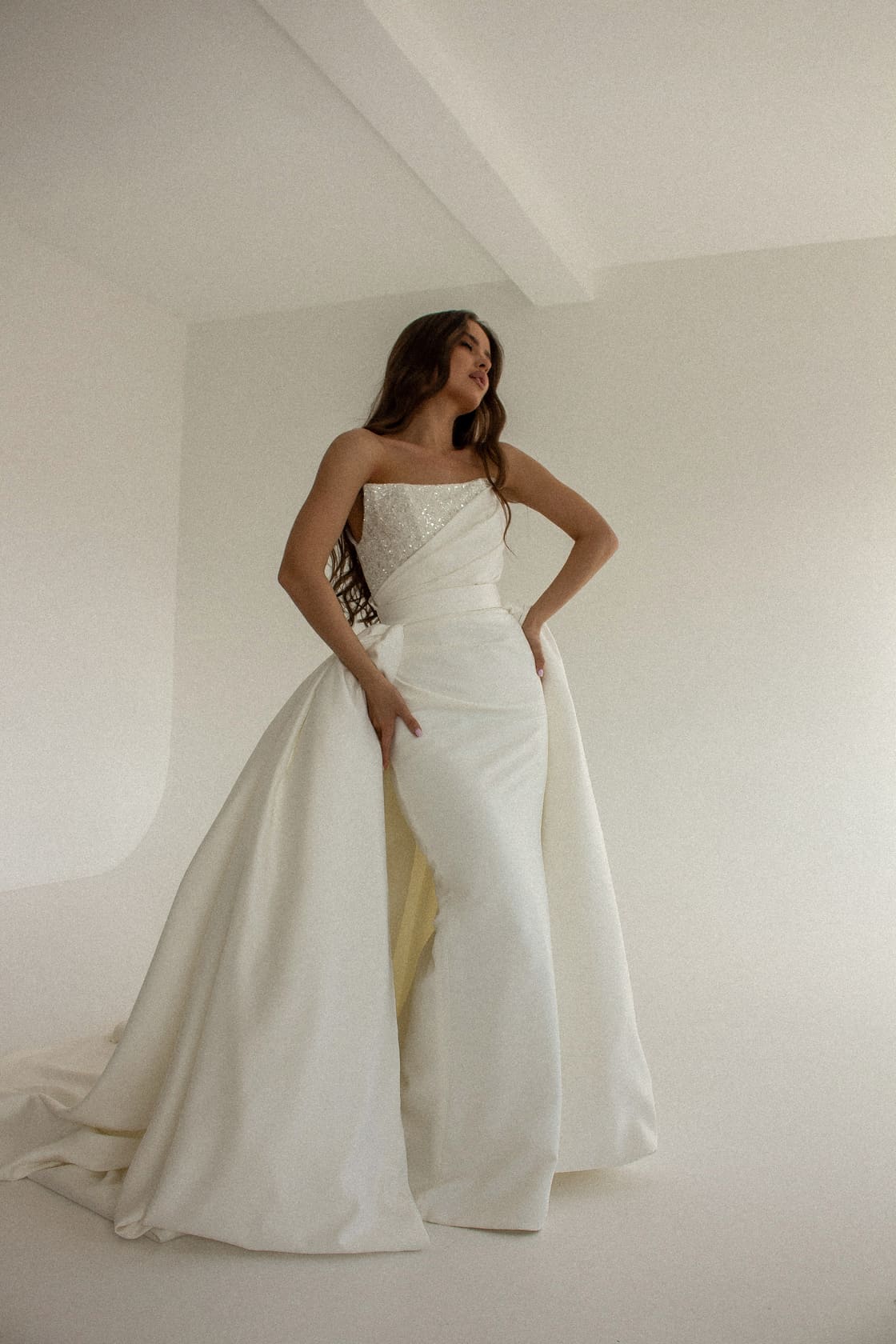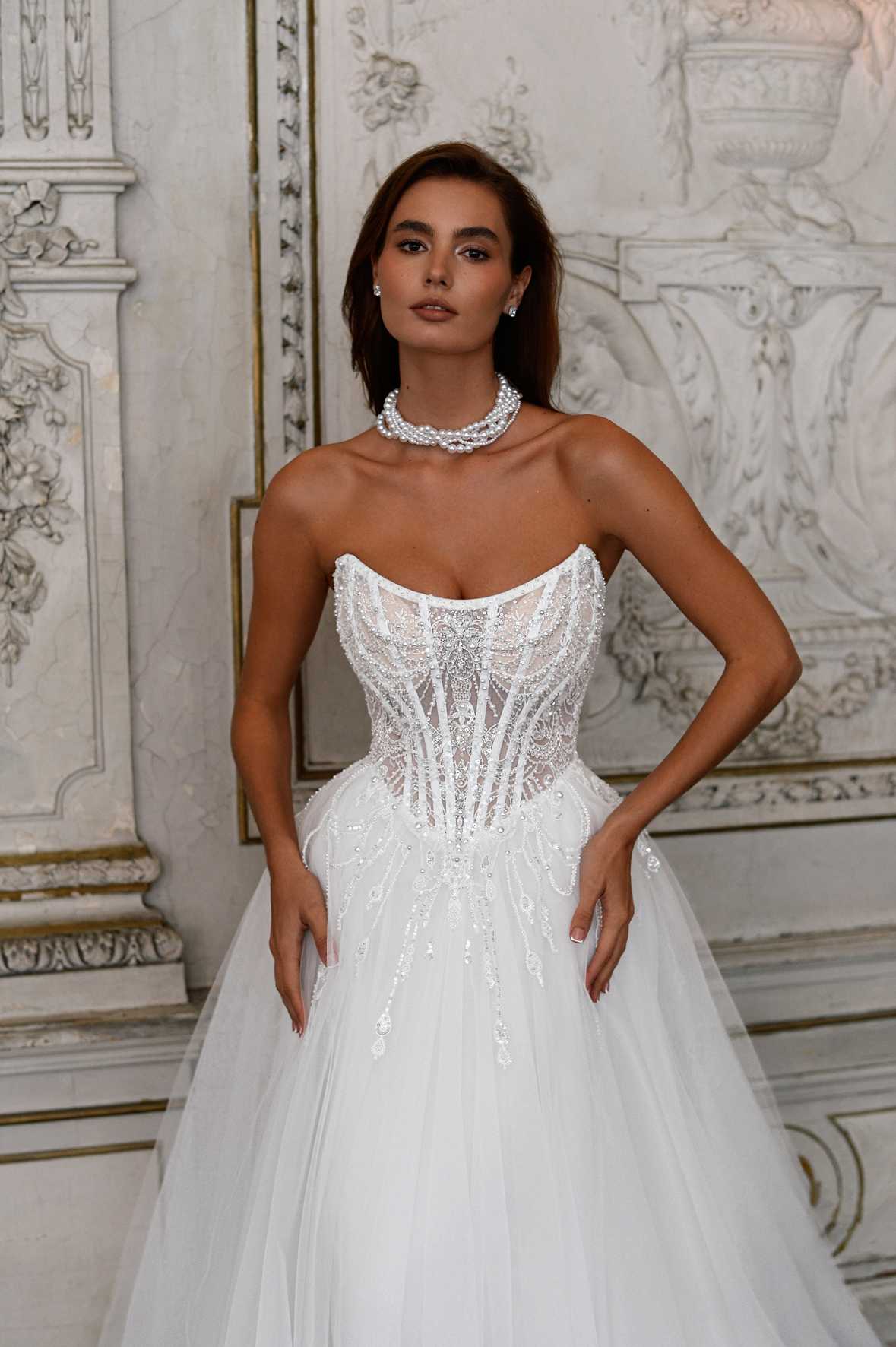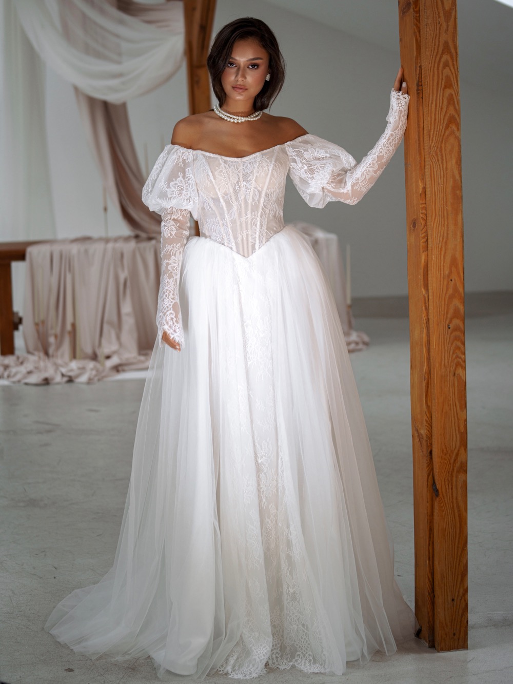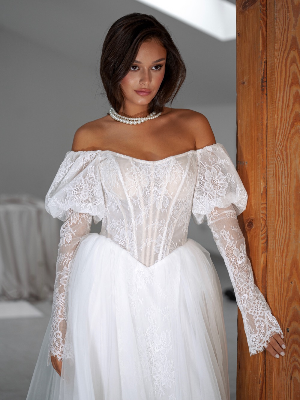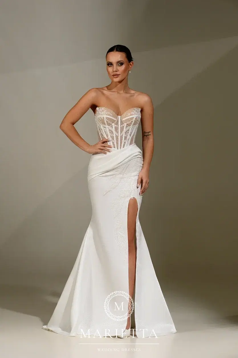 «Dazy» — платье с плотным корсетом, открытым верхом и нежным блеском. Со съемными рукавами. Привлекательность и изящество в одном. Представляем вам «Dazy» — свадебное платье с плотным корсетом, открытым верхом и нежным блеском. Это уникальное платье-трансформер, которое станет настоящим акцентом вашего образа в такой важный день. Одна из главных особенностей этого платья — съемные рукава. Вы можете выбрать, носить ли их или нет, чтобы создать идеальный стиль, который подчеркнет вашу индивидуальность. Корсет сияет блестками, приковывая взгляды окружающих и придающий вашему образу роскошный вид. Простая юбка делает это платье еще более привлекательным для наших невест. Она добавляет легкости и удобства при движении. Маленький шлейф не только создает комфорт при носке и визуально вытягивает силуэт на фото, но и придает вашему образу элегантности и изысканности. Но настоящая магия «Dazy» проявляется при освещении. Нежный блеск платья подчеркнет вашу красоту и привлечет восхищенные взгляды окружающих, будь то вечернее освещение или солнечные лучи. «Dazy» — это не просто свадебное платье, это настоящий образец стиля и изысканности. Вы можете арендовать его в нашем свадебном салоне «Миллениум» и стать настоящей королевой на своей свадьбе.