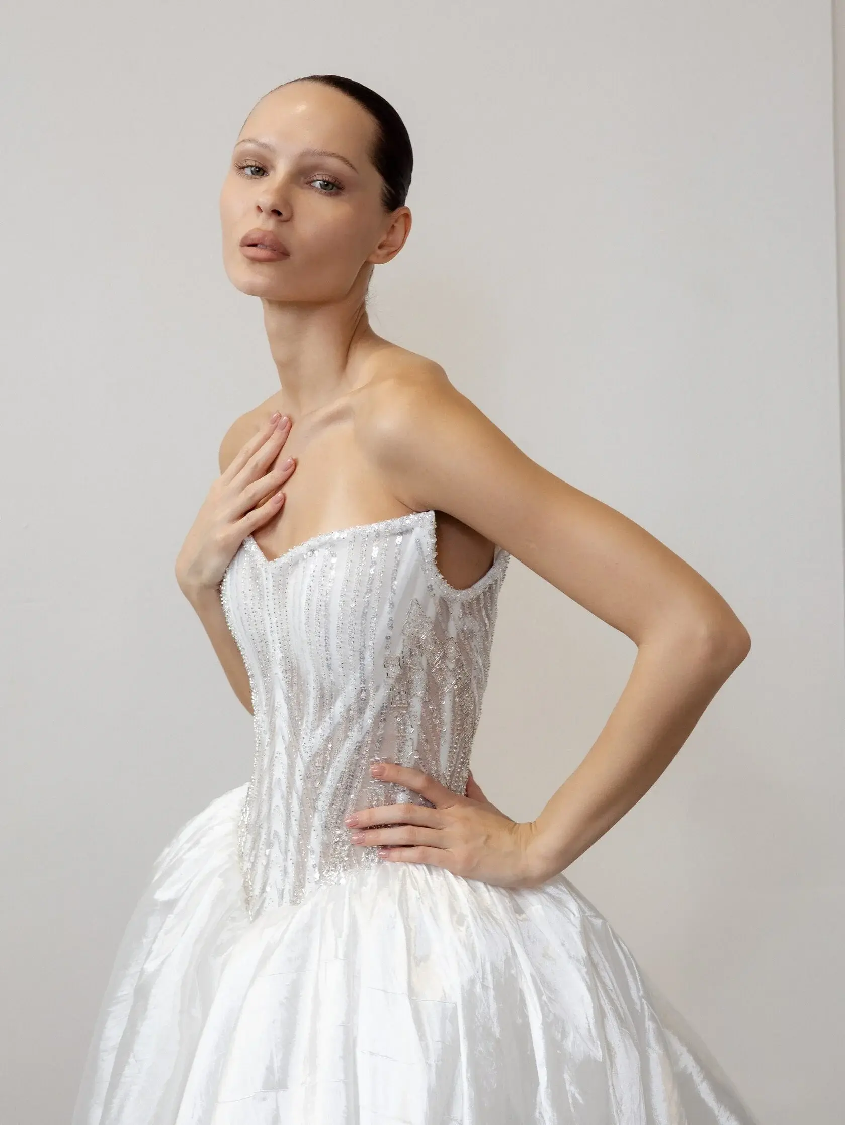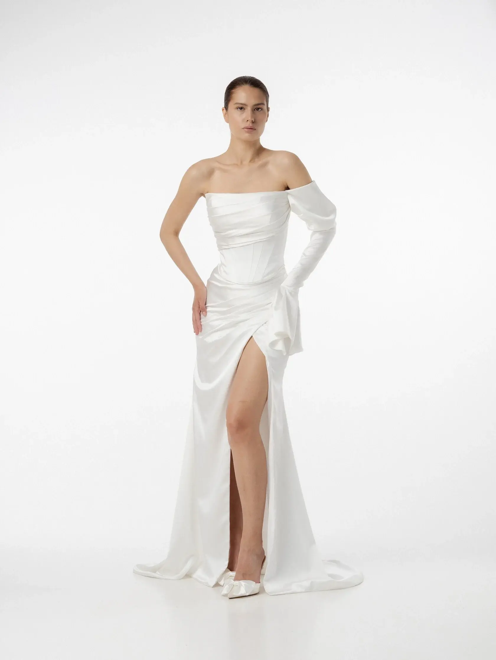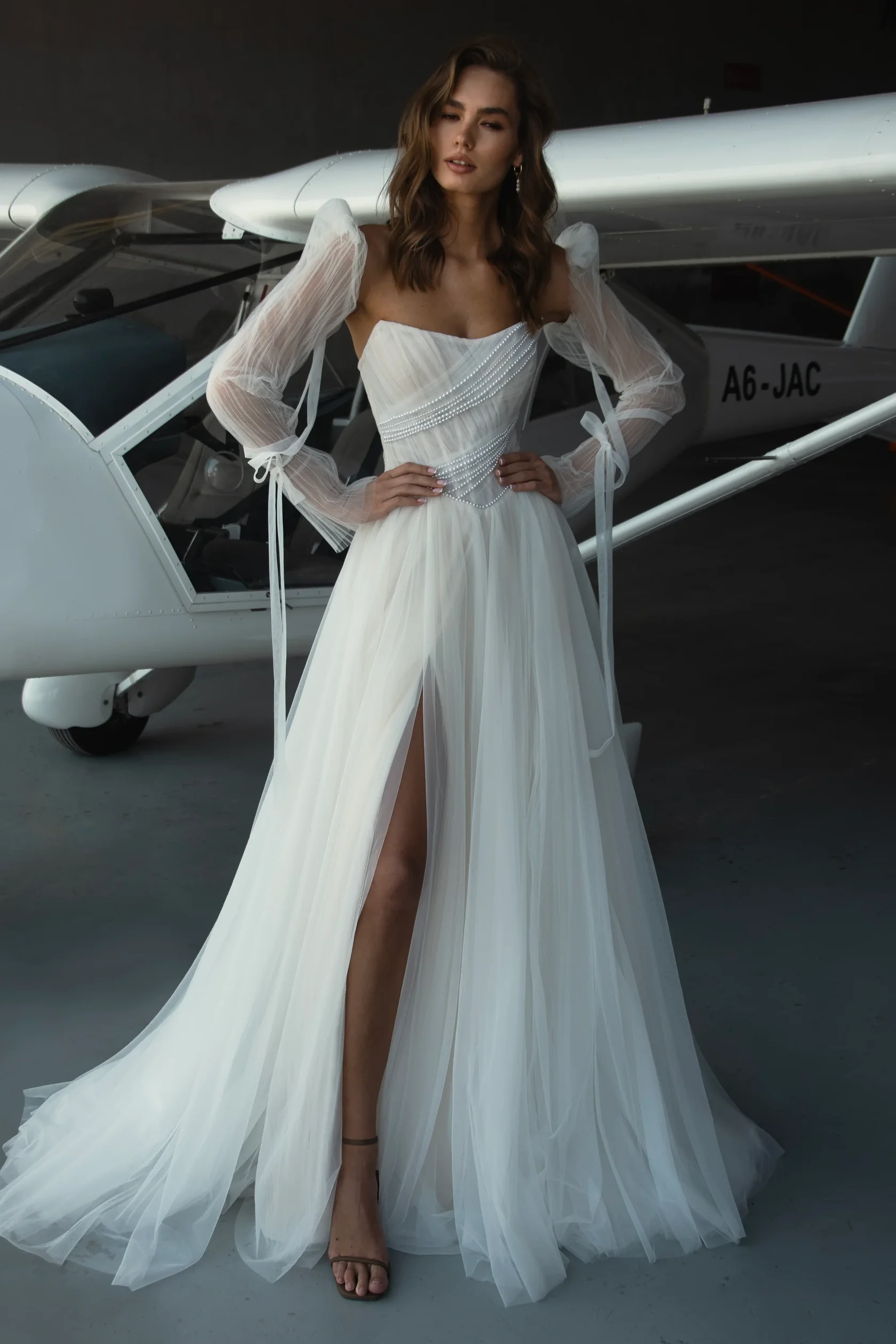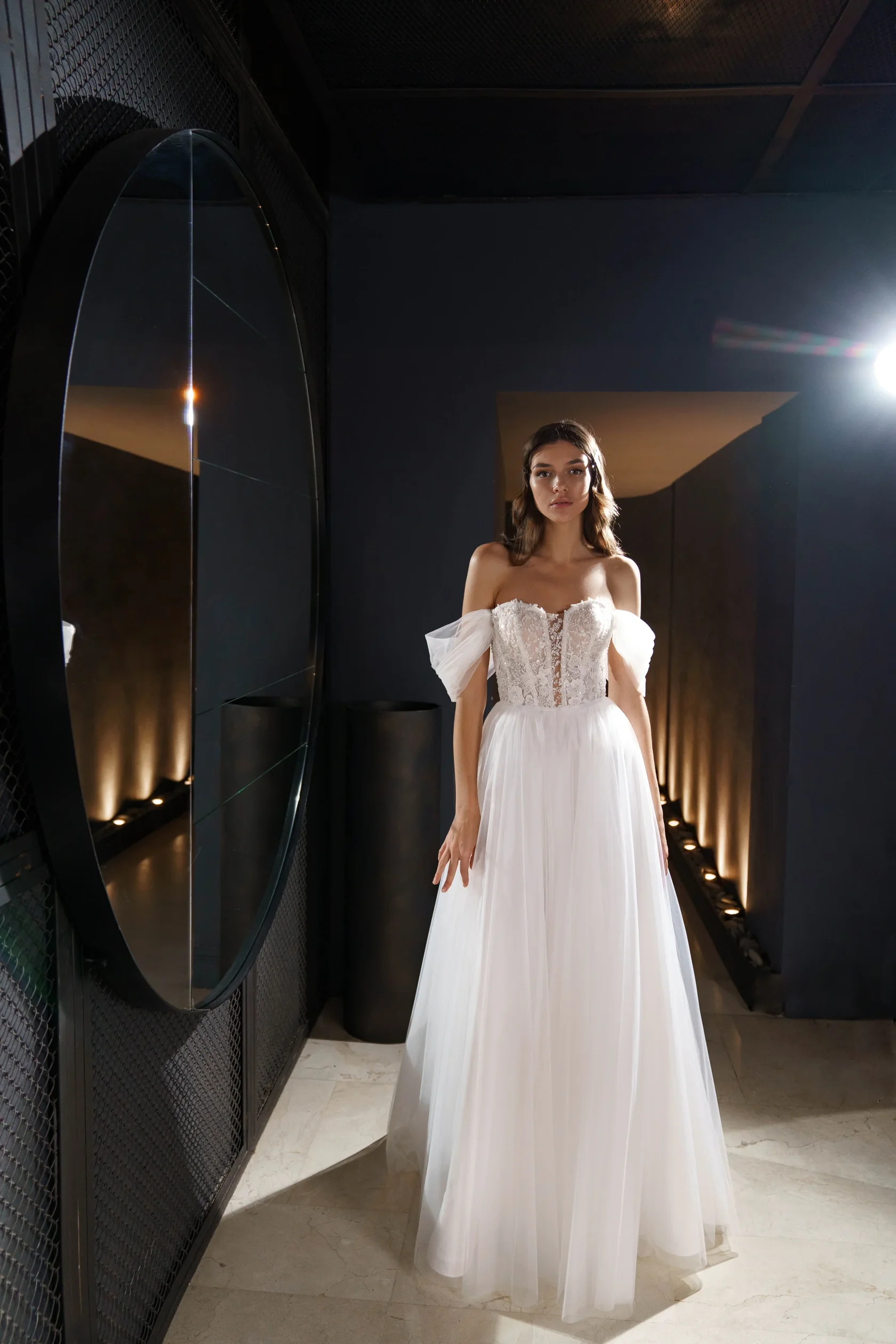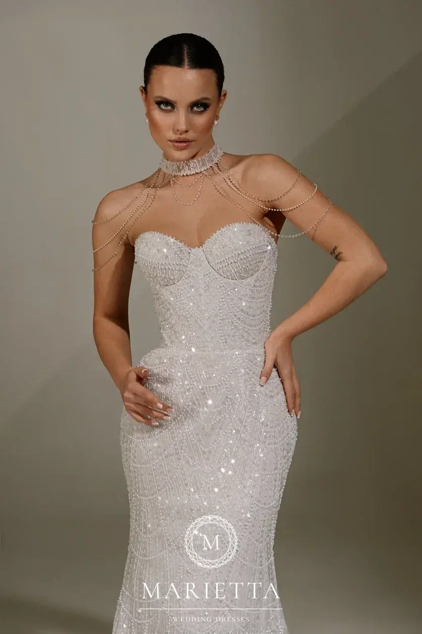 «Dazy» — платье с плотным корсетом, открытым верхом и нежным блеском. Со съемными рукавами. Привлекательность и изящество в одном. Представляем вам «Dazy» — свадебное платье с плотным корсетом, открытым верхом и нежным блеском. Это уникальное платье-трансформер, которое станет настоящим акцентом вашего образа в такой важный день. Одна из главных особенностей этого платья — съемные рукава. Вы можете выбрать, носить ли их или нет, чтобы создать идеальный стиль, который подчеркнет вашу индивидуальность. Корсет сияет блестками, приковывая взгляды окружающих и придающий вашему образу роскошный вид. Простая юбка делает это платье еще более привлекательным для наших невест. Она добавляет легкости и удобства при движении. Маленький шлейф не только создает комфорт при носке и визуально вытягивает силуэт на фото, но и придает вашему образу элегантности и изысканности. Но настоящая магия «Dazy» проявляется при освещении. Нежный блеск платья подчеркнет вашу красоту и привлечет восхищенные взгляды окружающих, будь то вечернее освещение или солнечные лучи. «Dazy» — это не просто свадебное платье, это настоящий образец стиля и изысканности. Вы можете арендовать его в нашем свадебном салоне «Миллениум» и стать настоящей королевой на своей свадьбе.