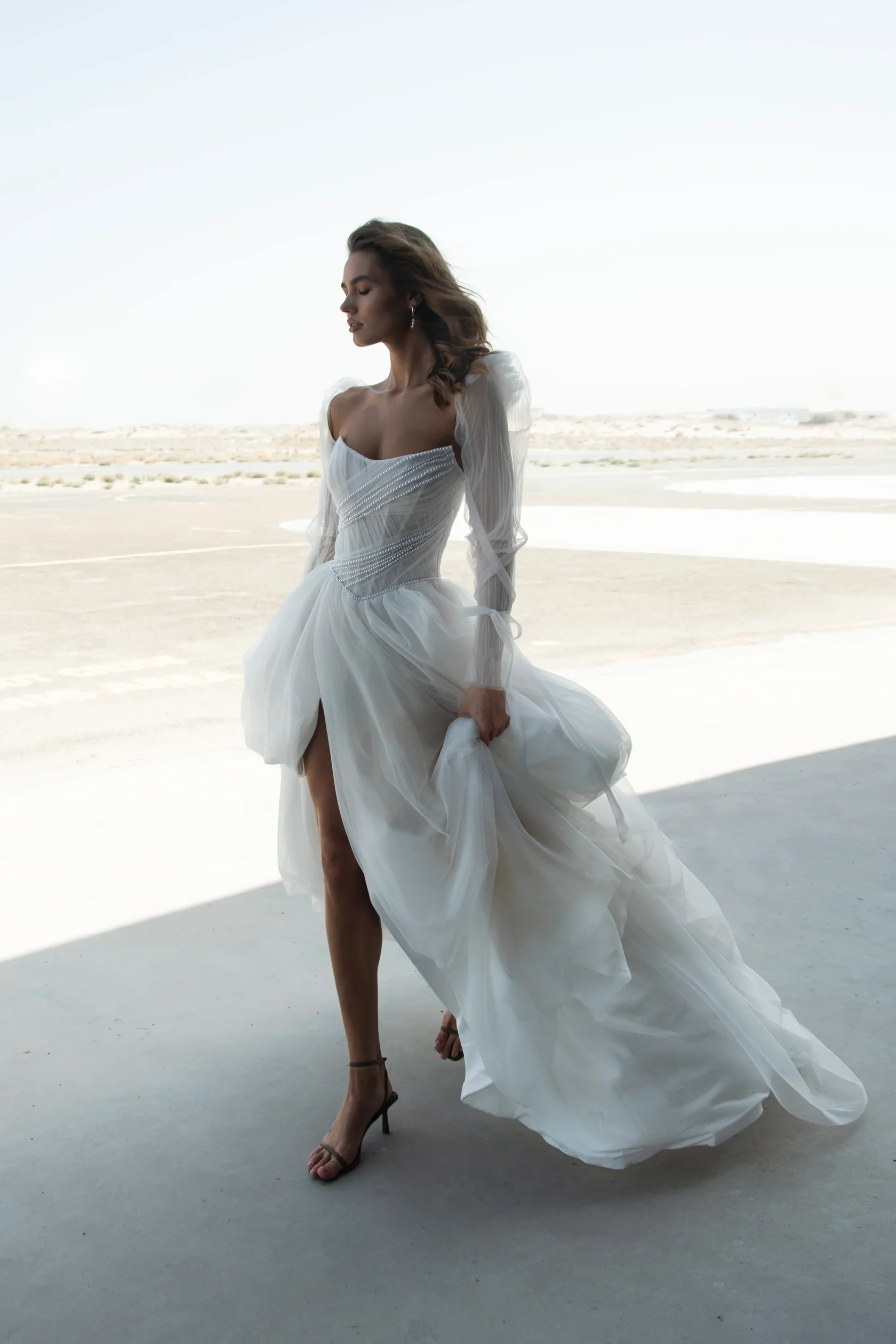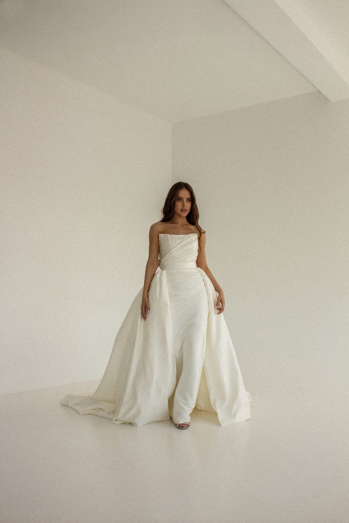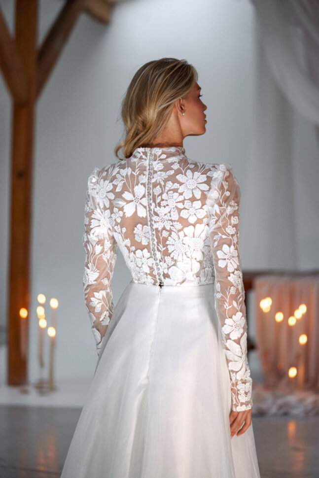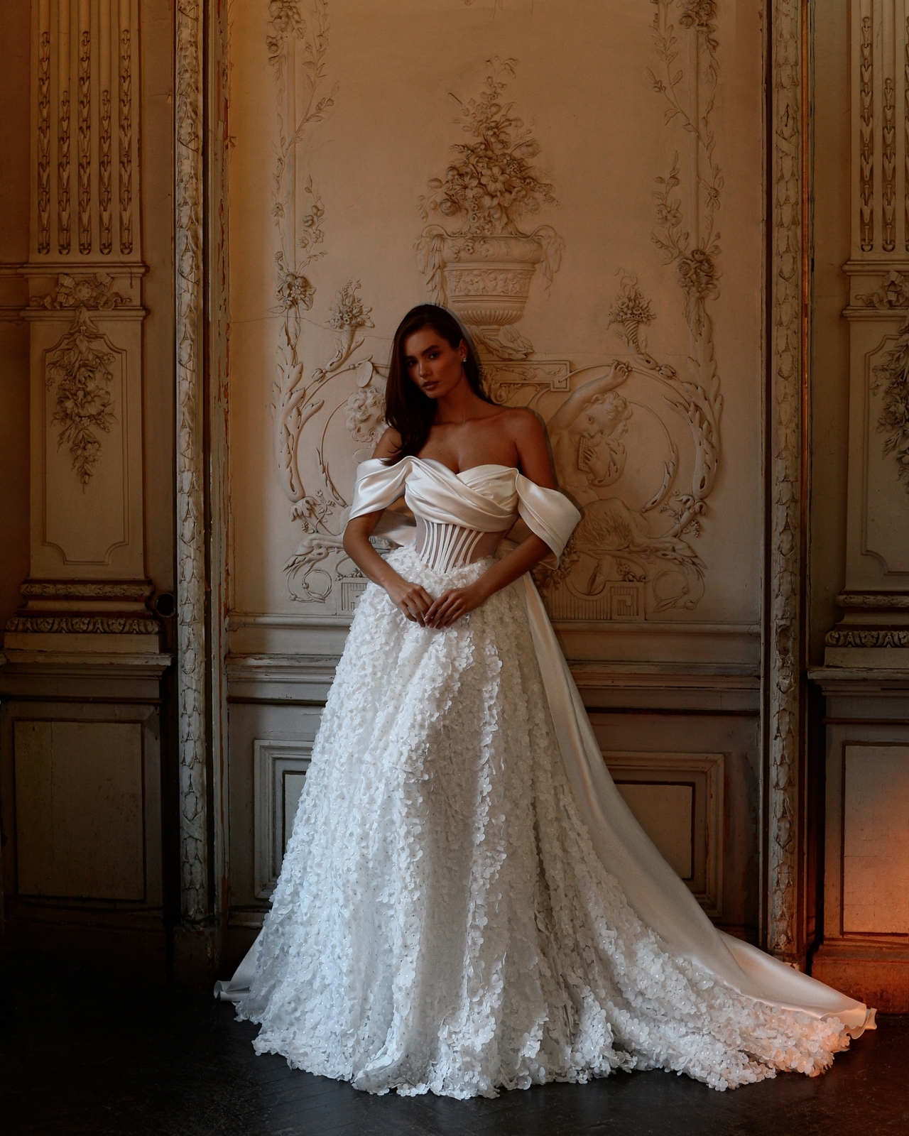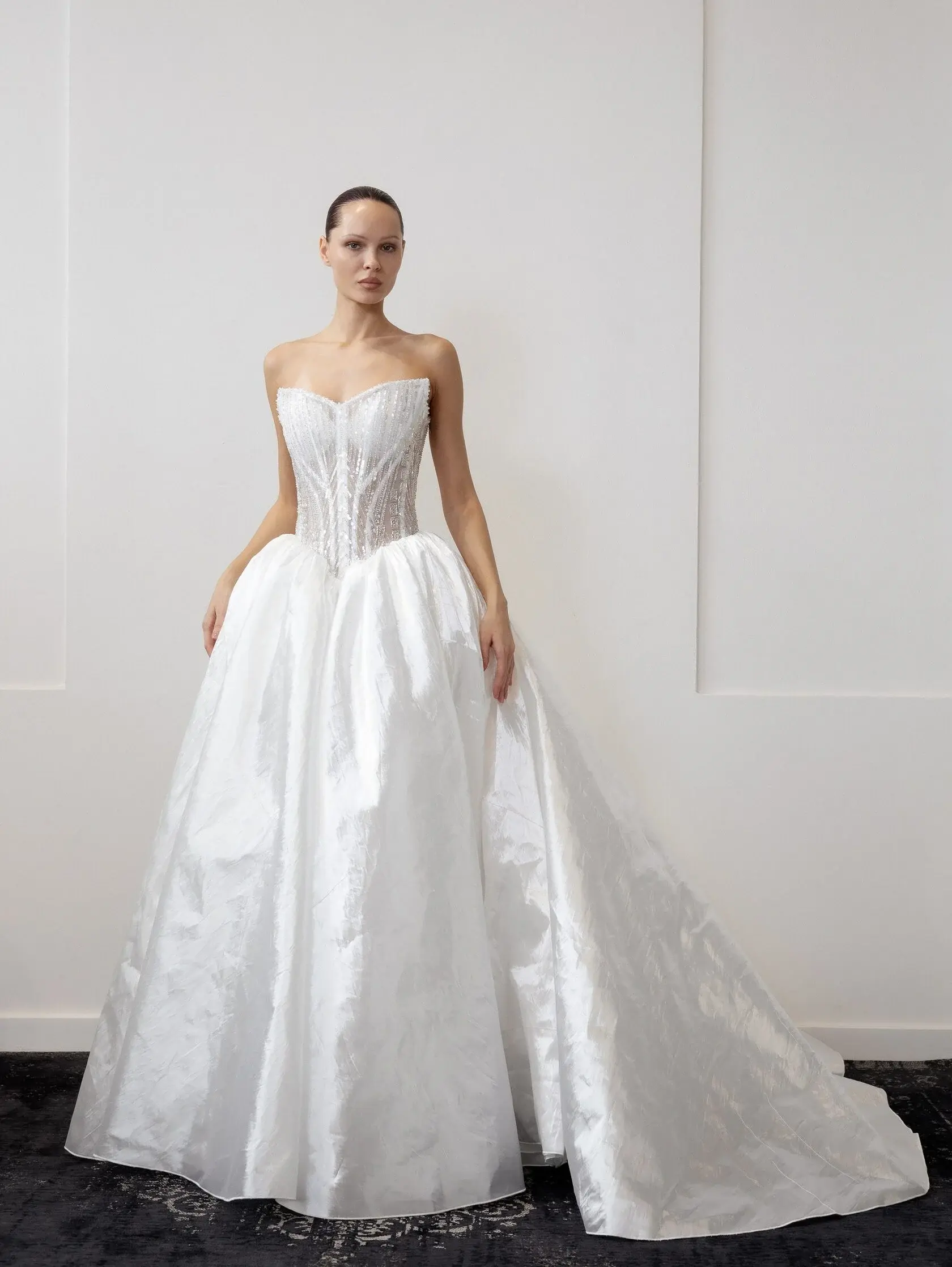 «Dazy» — платье с плотным корсетом, открытым верхом и нежным блеском. Со съемными рукавами. Привлекательность и изящество в одном. Представляем вам «Dazy» — свадебное платье с плотным корсетом, открытым верхом и нежным блеском. Это уникальное платье-трансформер, которое станет настоящим акцентом вашего образа в такой важный день. Одна из главных особенностей этого платья — съемные рукава. Вы можете выбрать, носить ли их или нет, чтобы создать идеальный стиль, который подчеркнет вашу индивидуальность. Корсет сияет блестками, приковывая взгляды окружающих и придающий вашему образу роскошный вид. Простая юбка делает это платье еще более привлекательным для наших невест. Она добавляет легкости и удобства при движении. Маленький шлейф не только создает комфорт при носке и визуально вытягивает силуэт на фото, но и придает вашему образу элегантности и изысканности. Но настоящая магия «Dazy» проявляется при освещении. Нежный блеск платья подчеркнет вашу красоту и привлечет восхищенные взгляды окружающих, будь то вечернее освещение или солнечные лучи. «Dazy» — это не просто свадебное платье, это настоящий образец стиля и изысканности. Вы можете арендовать его в нашем свадебном салоне «Миллениум» и стать настоящей королевой на своей свадьбе.