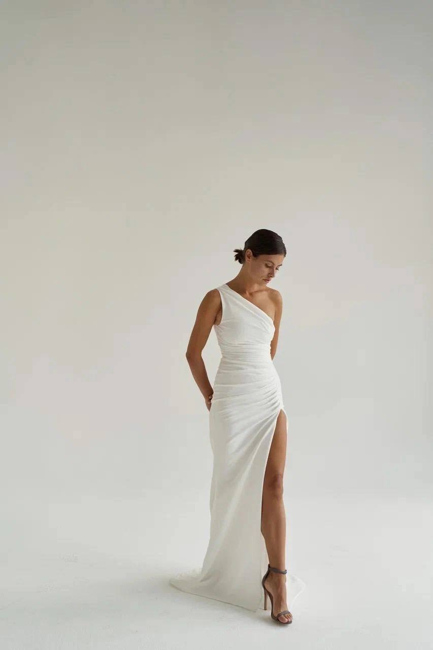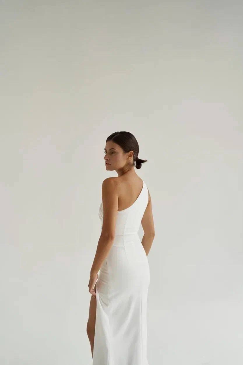 Свадебное платье облегающего силуэта с одной бретелью и разрезом в юбке. Спинка на внутреннем корсете со шнуровкой и молнии. Основной материал: пайетки, бисер.