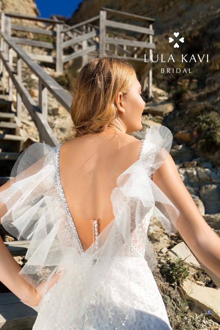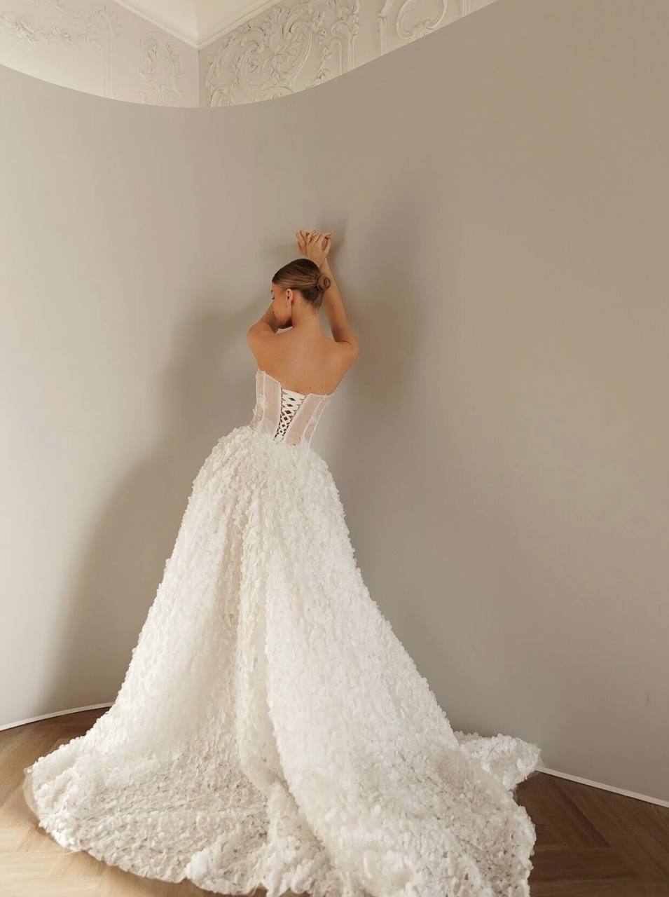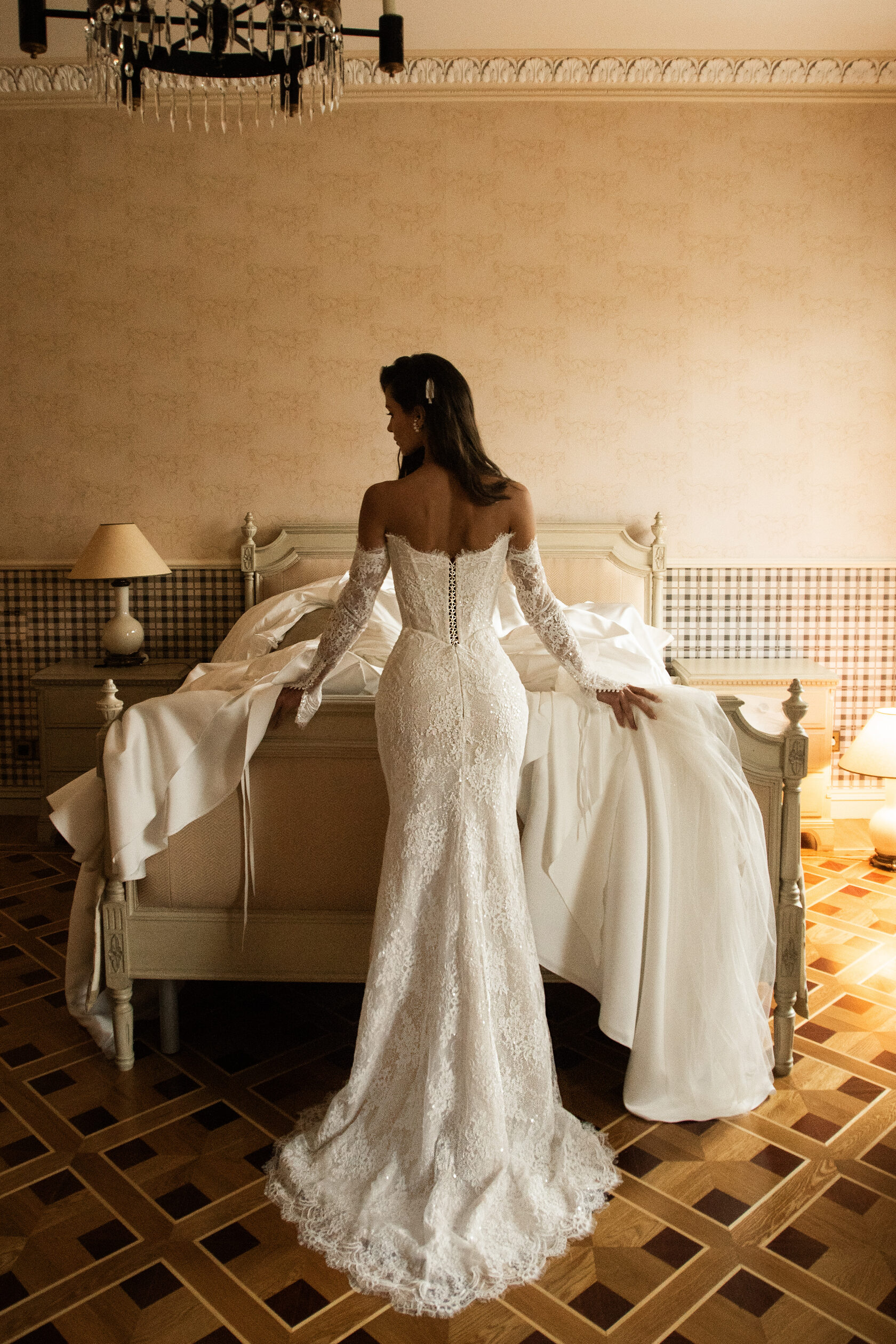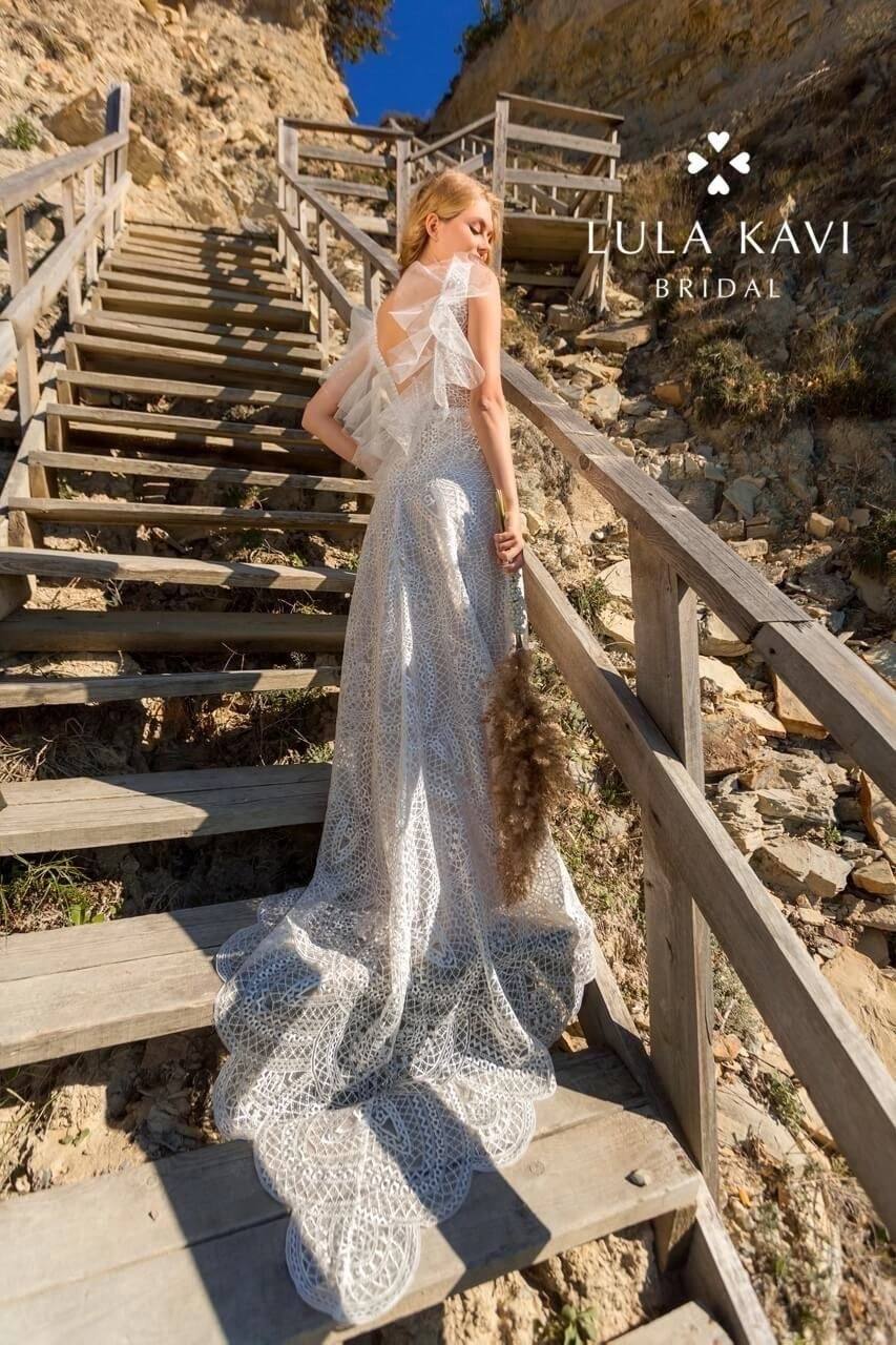 Свадебное платье «русалка» с прозрачным декольте и обнаженной спиной. Ткань с объемным узором сочетается с облегающим силуэтом. На плечах банты из длинных прозрачных лент. Зона декольте и талия украшены бисером. Юбка переходит в шлейф.