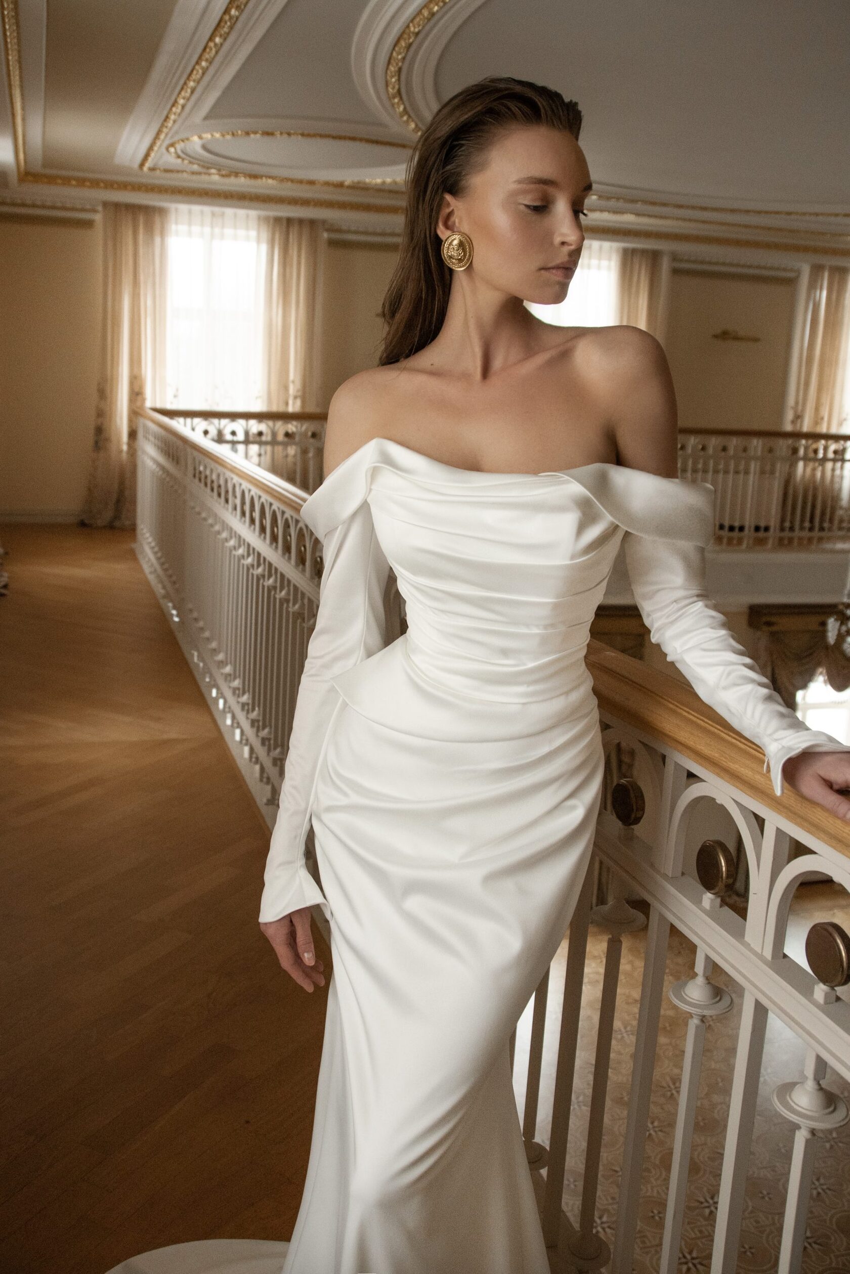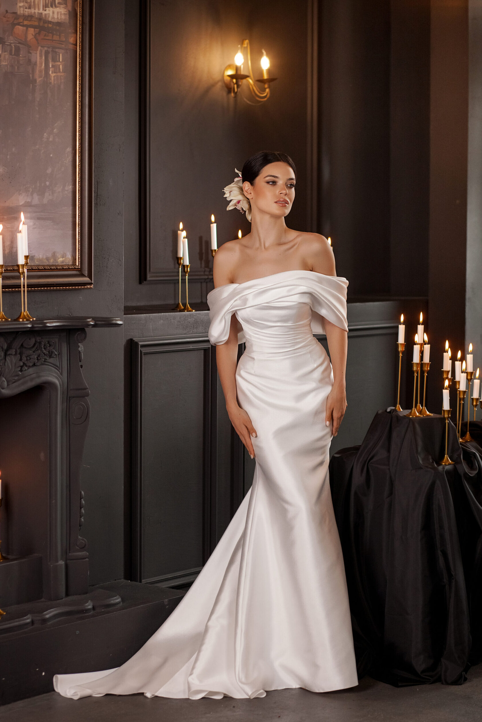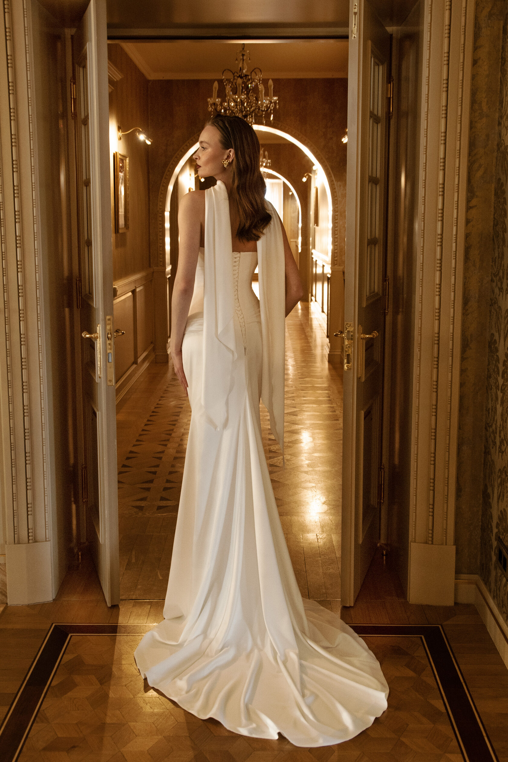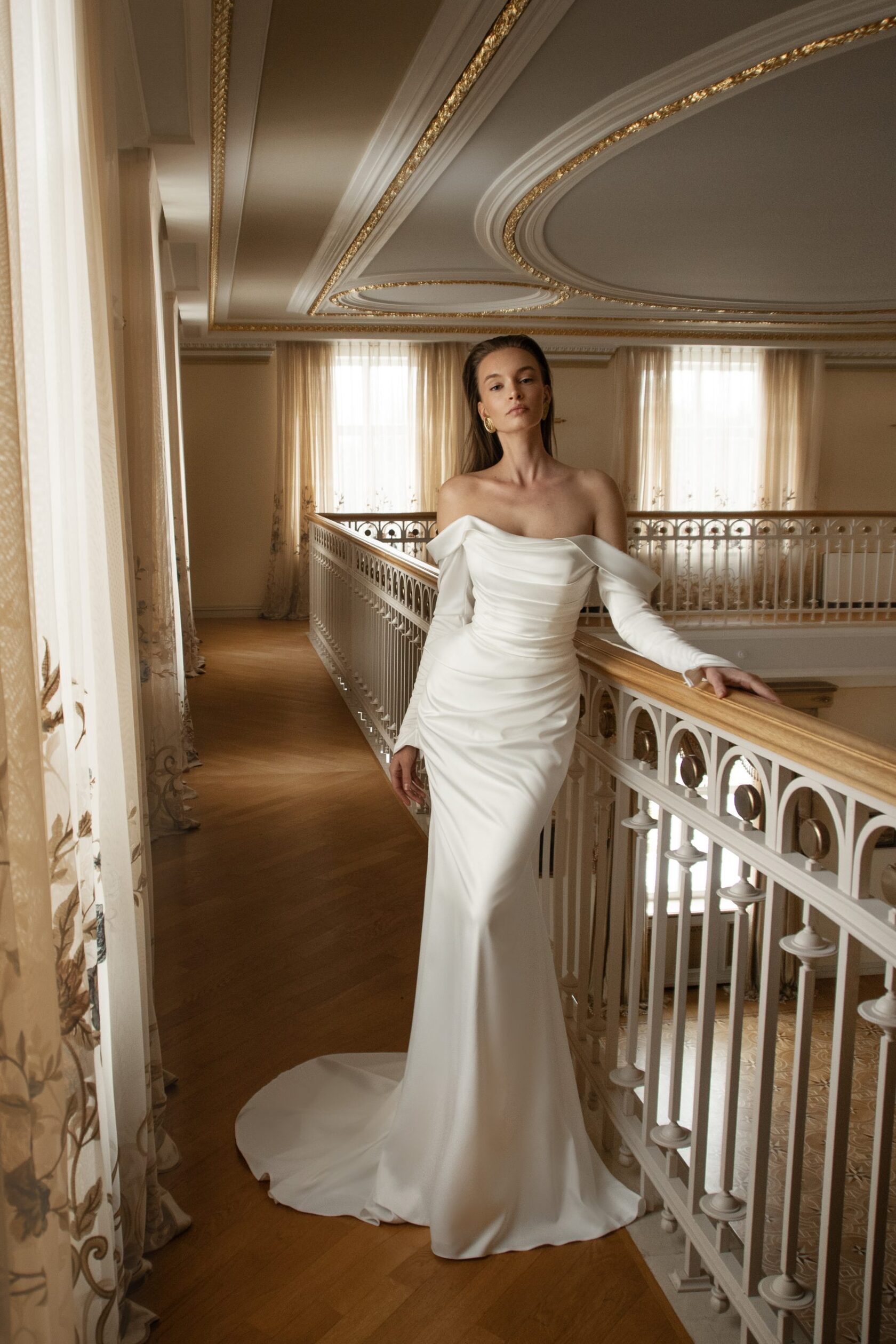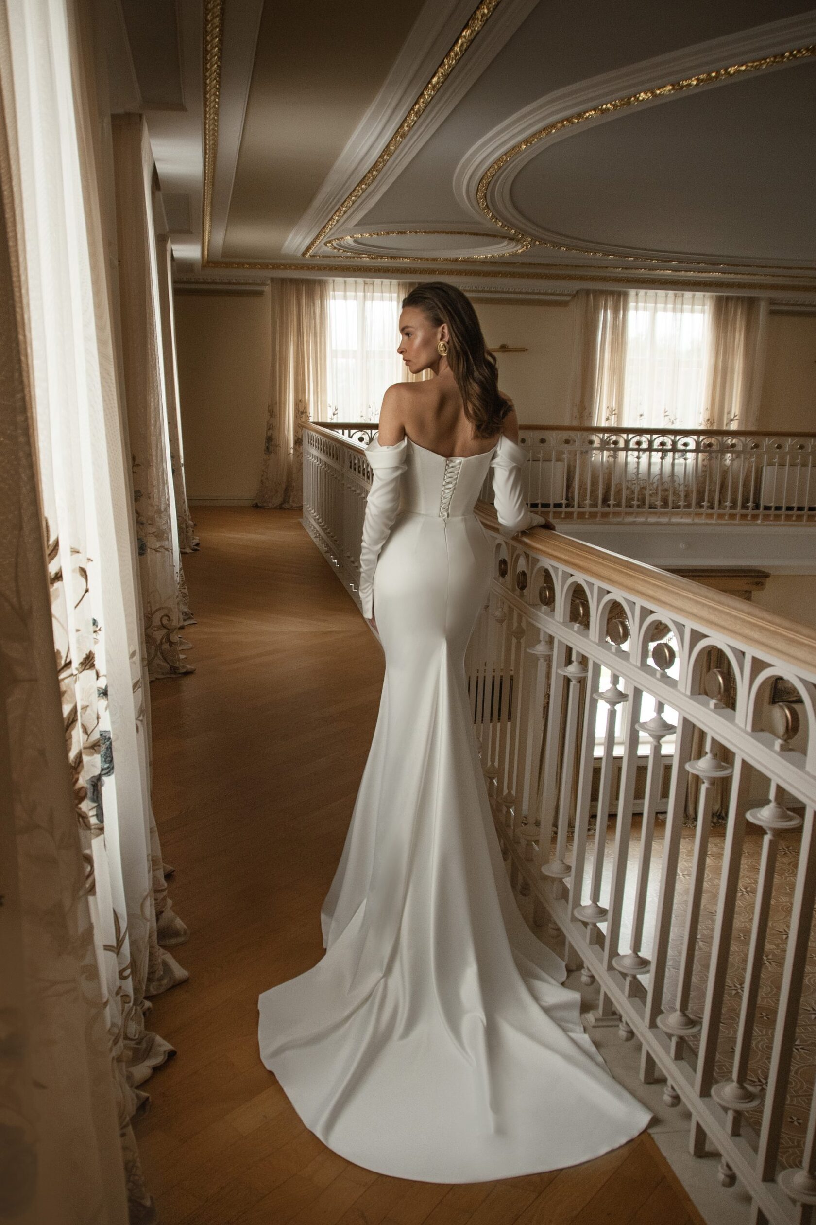 Запоминающееся свадебное платье, выполненное в прямом крое. Шарм и кинематографичность данной модели достойны места на самых пафосных голливудских дорожках. Открытые плечи и спина создают очень женственный и нежный образ.