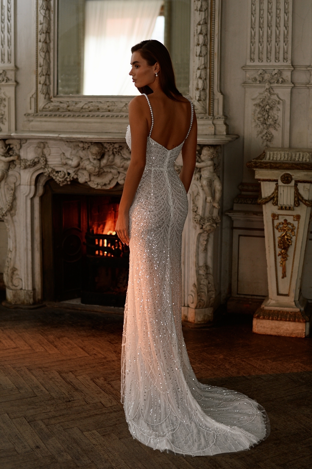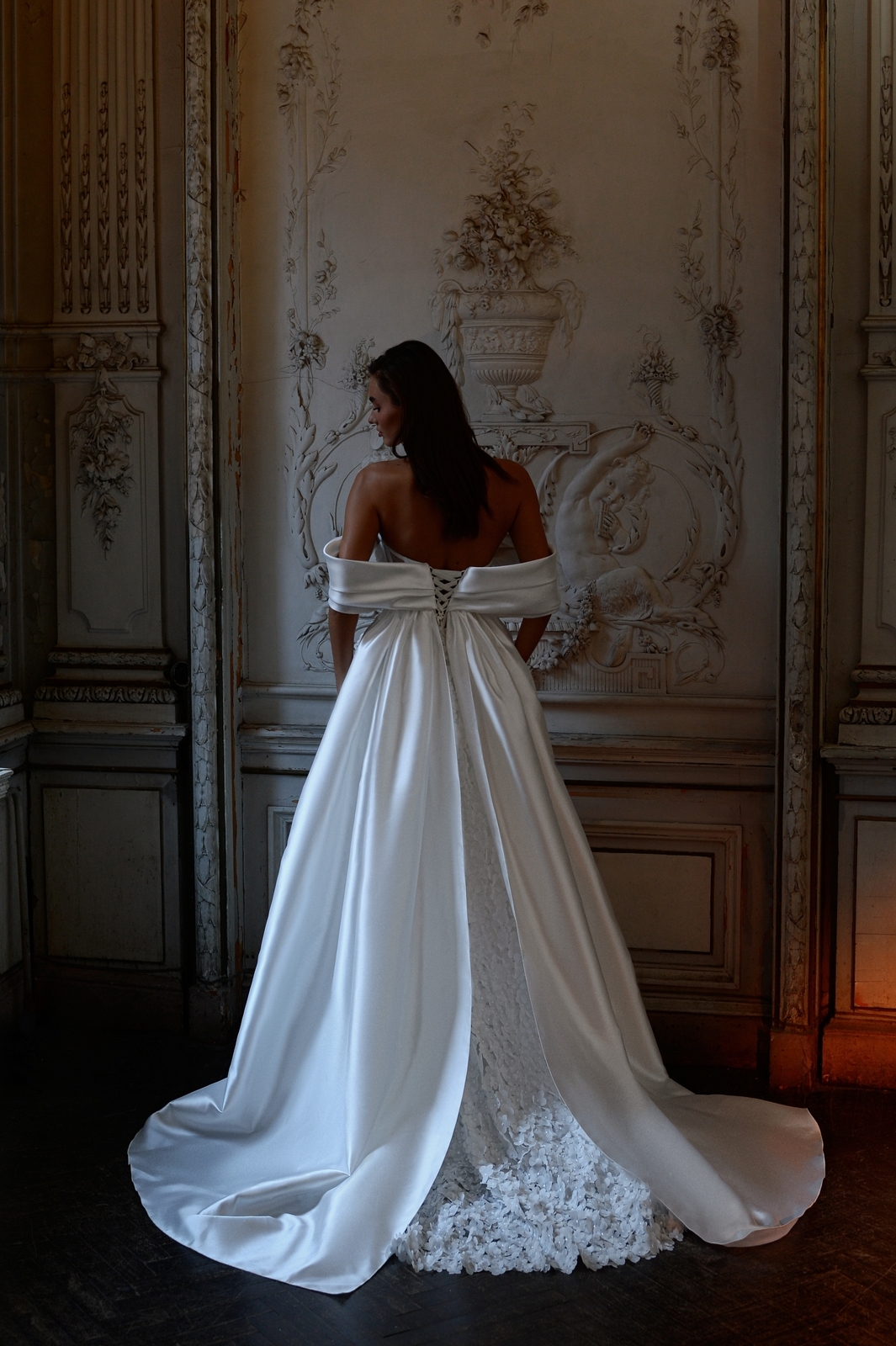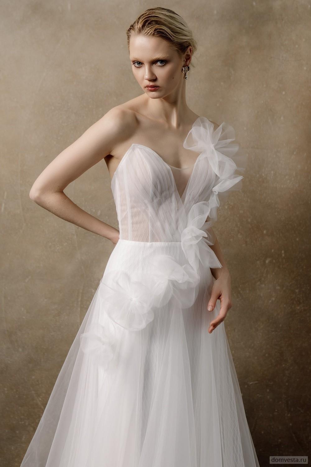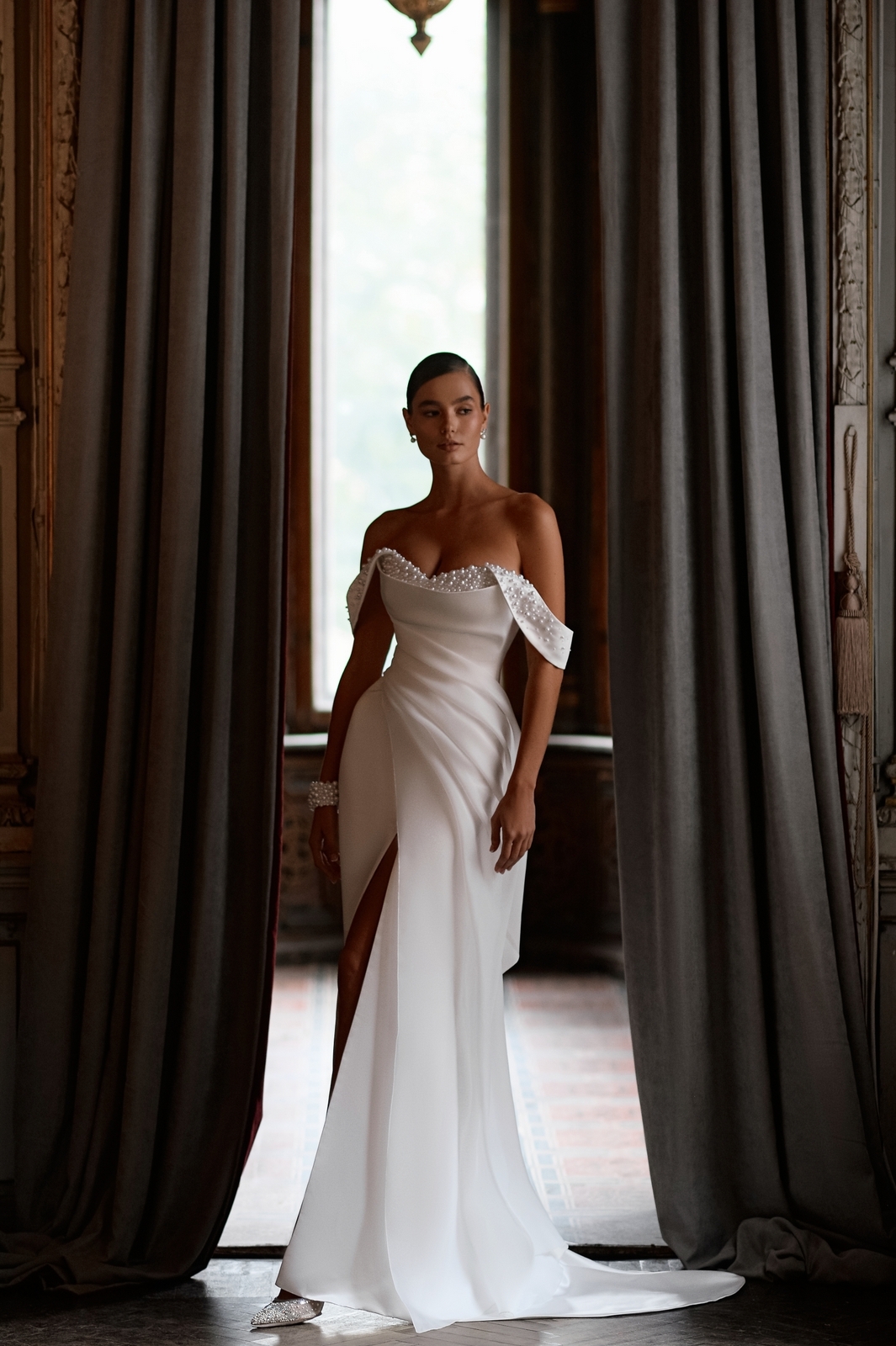 Запоминающееся свадебное платье, выполненное в прямом крое. Шарм и кинематографичность данной модели достойны места на самых пафосных голливудских дорожках. Открытые плечи и спина создают очень женственный и нежный образ.