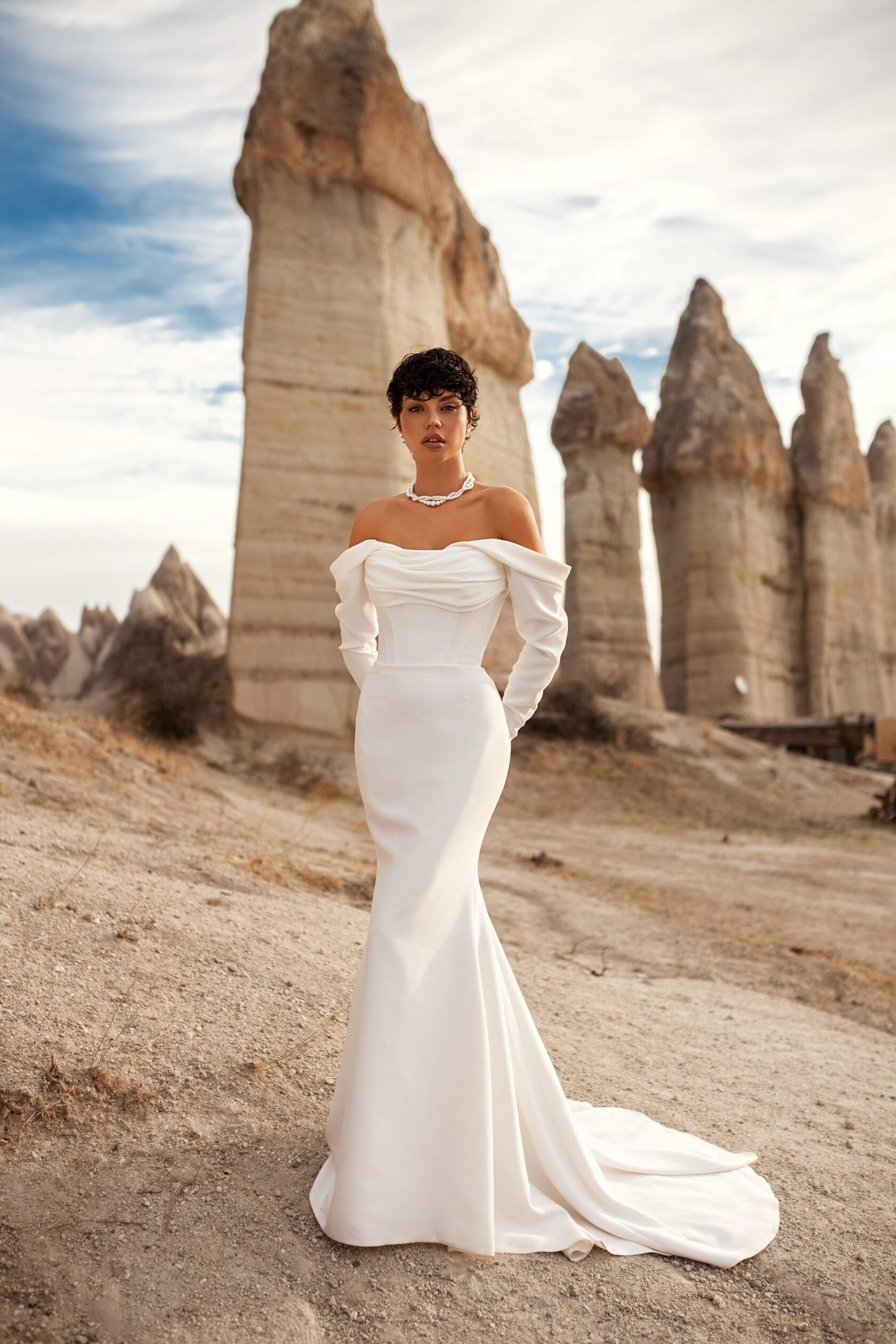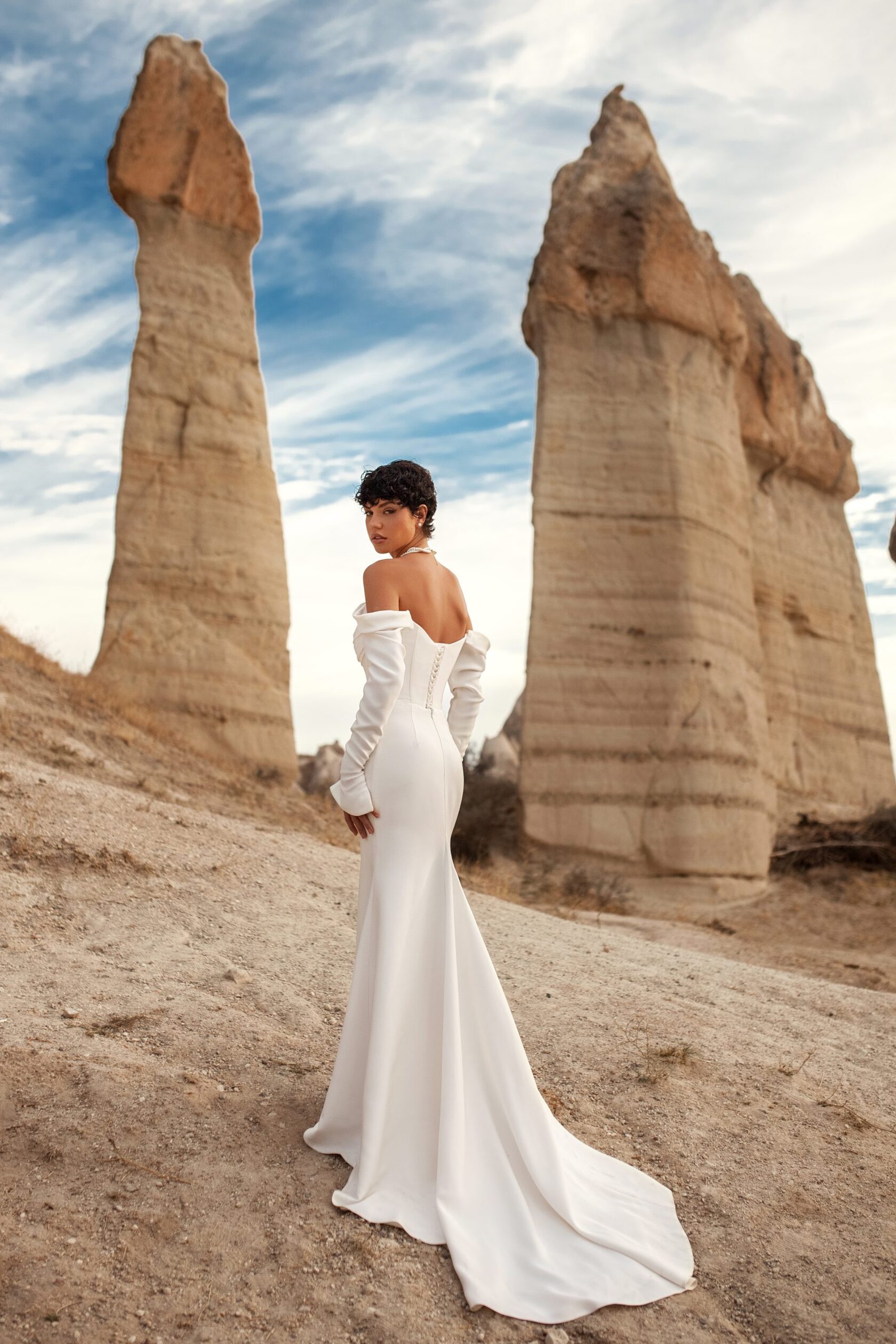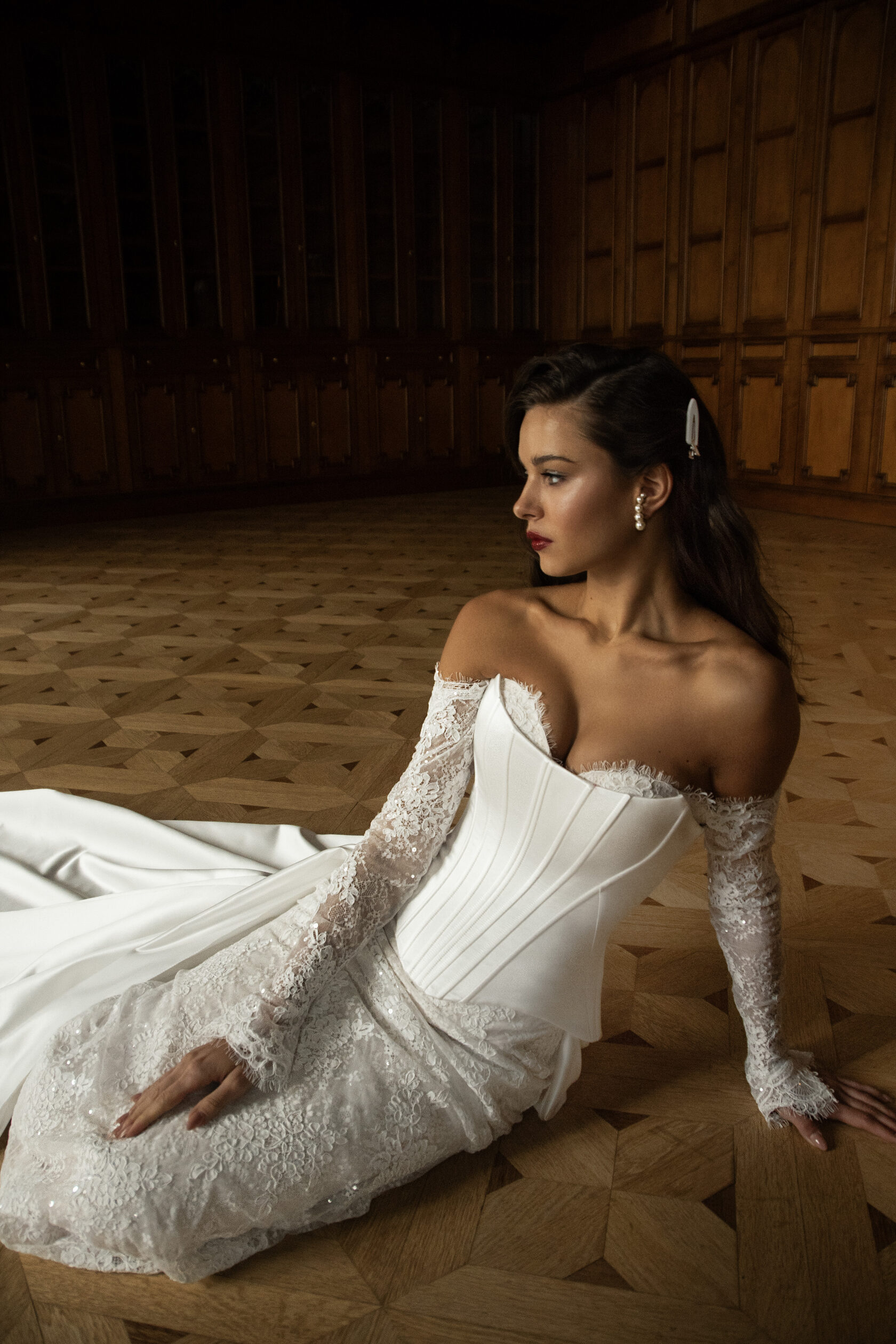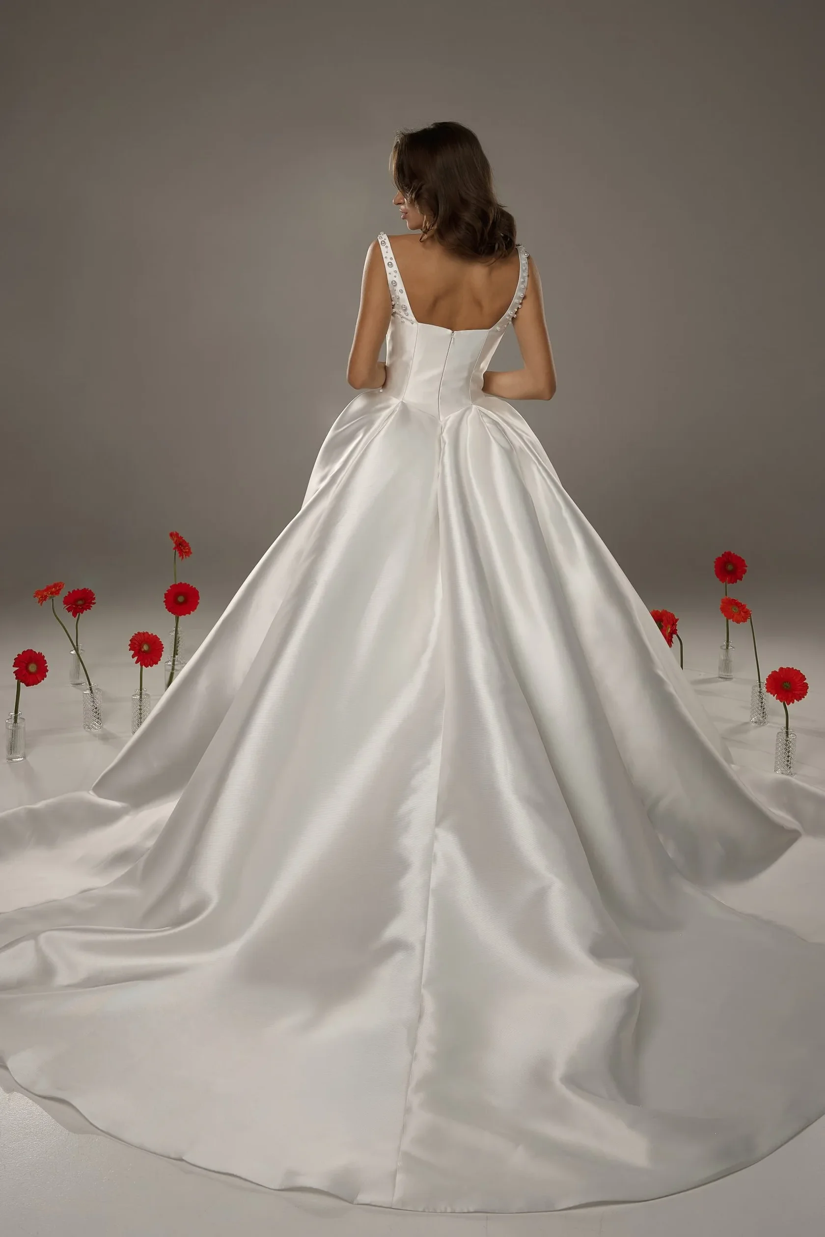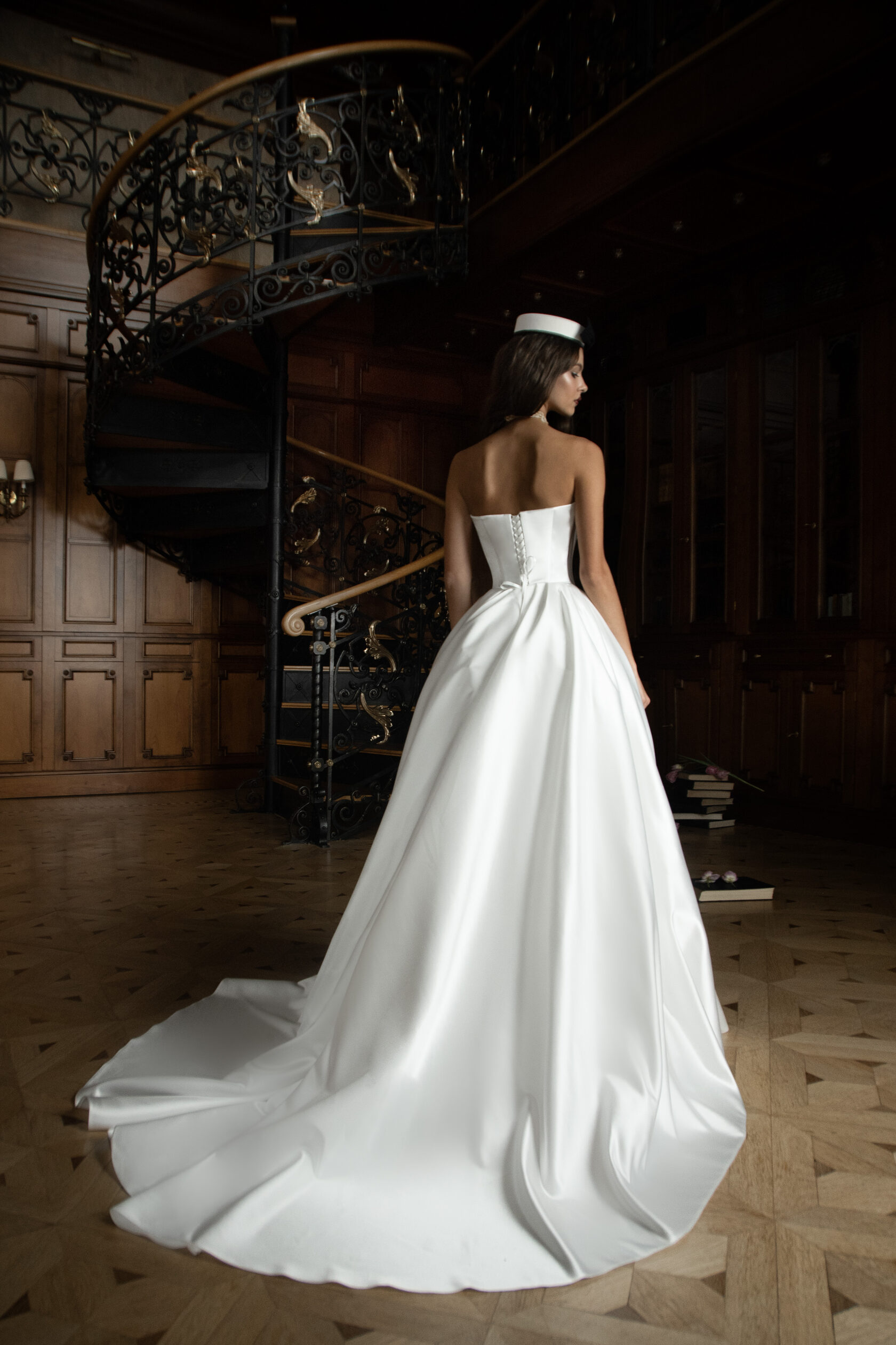 Запоминающееся свадебное платье, выполненное в прямом крое. Шарм и кинематографичность данной модели достойны места на самых пафосных голливудских дорожках. Открытые плечи и спина создают очень женственный и нежный образ.