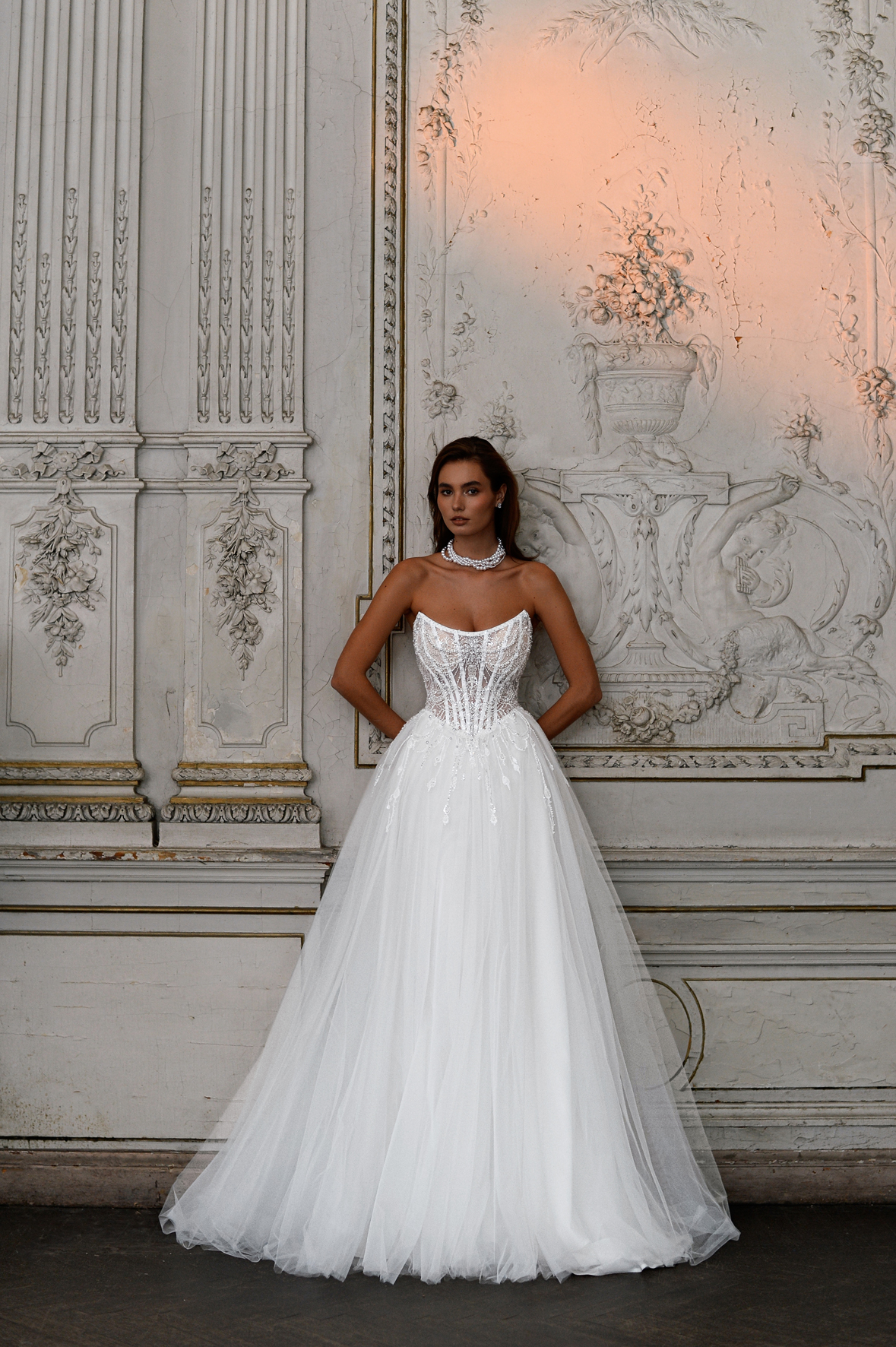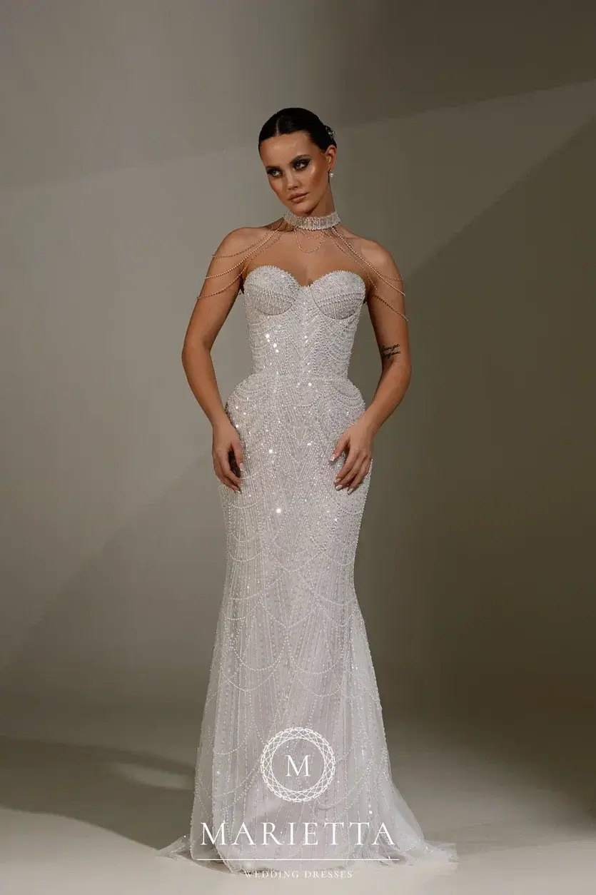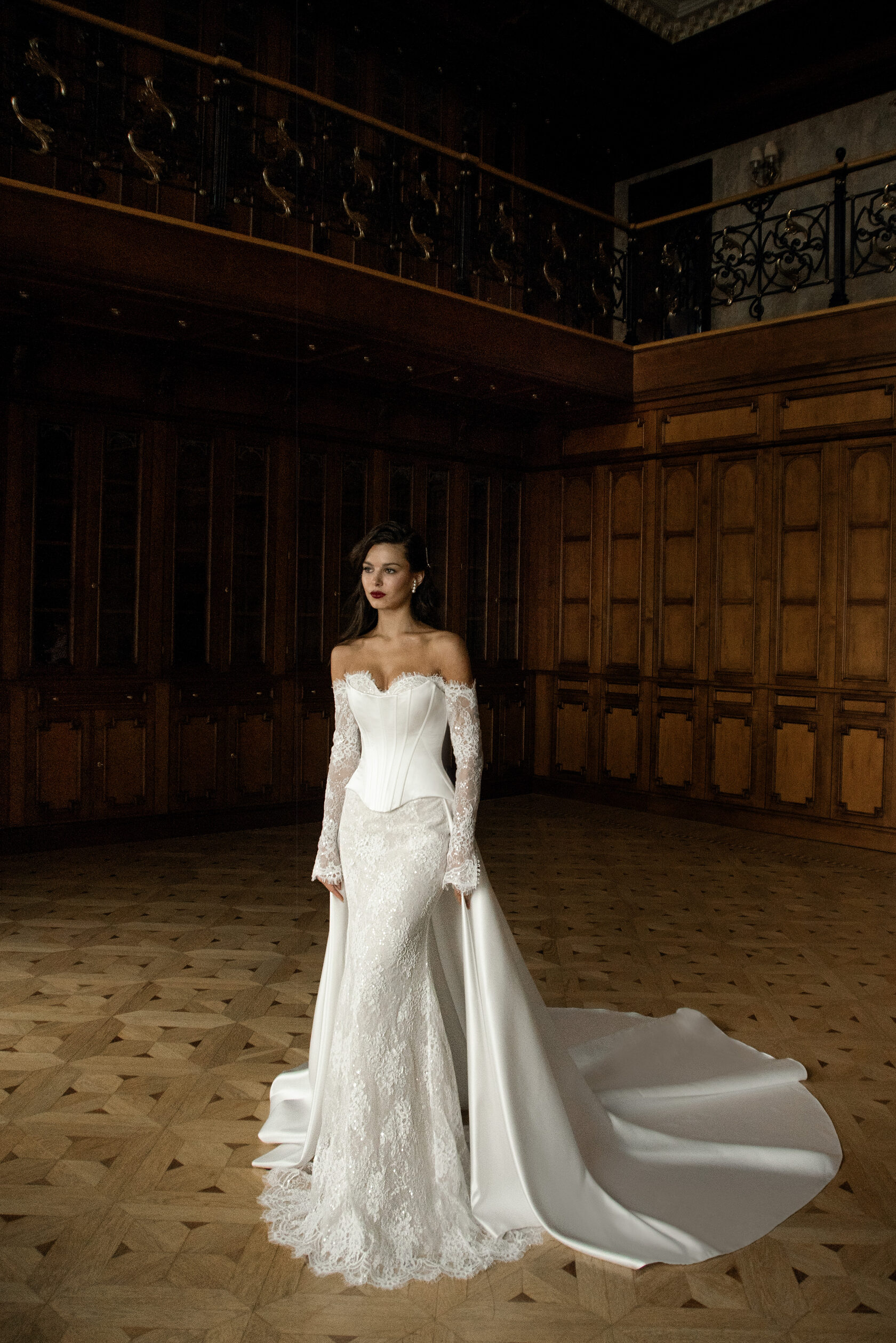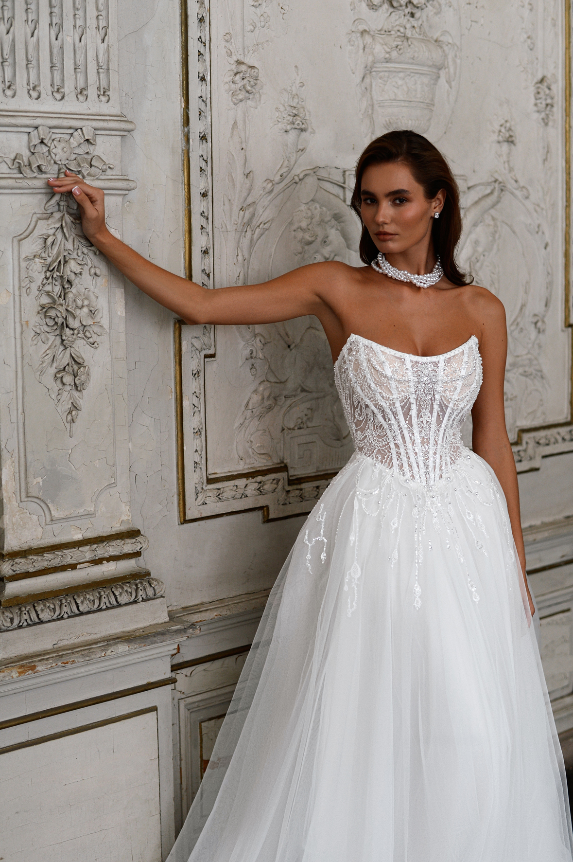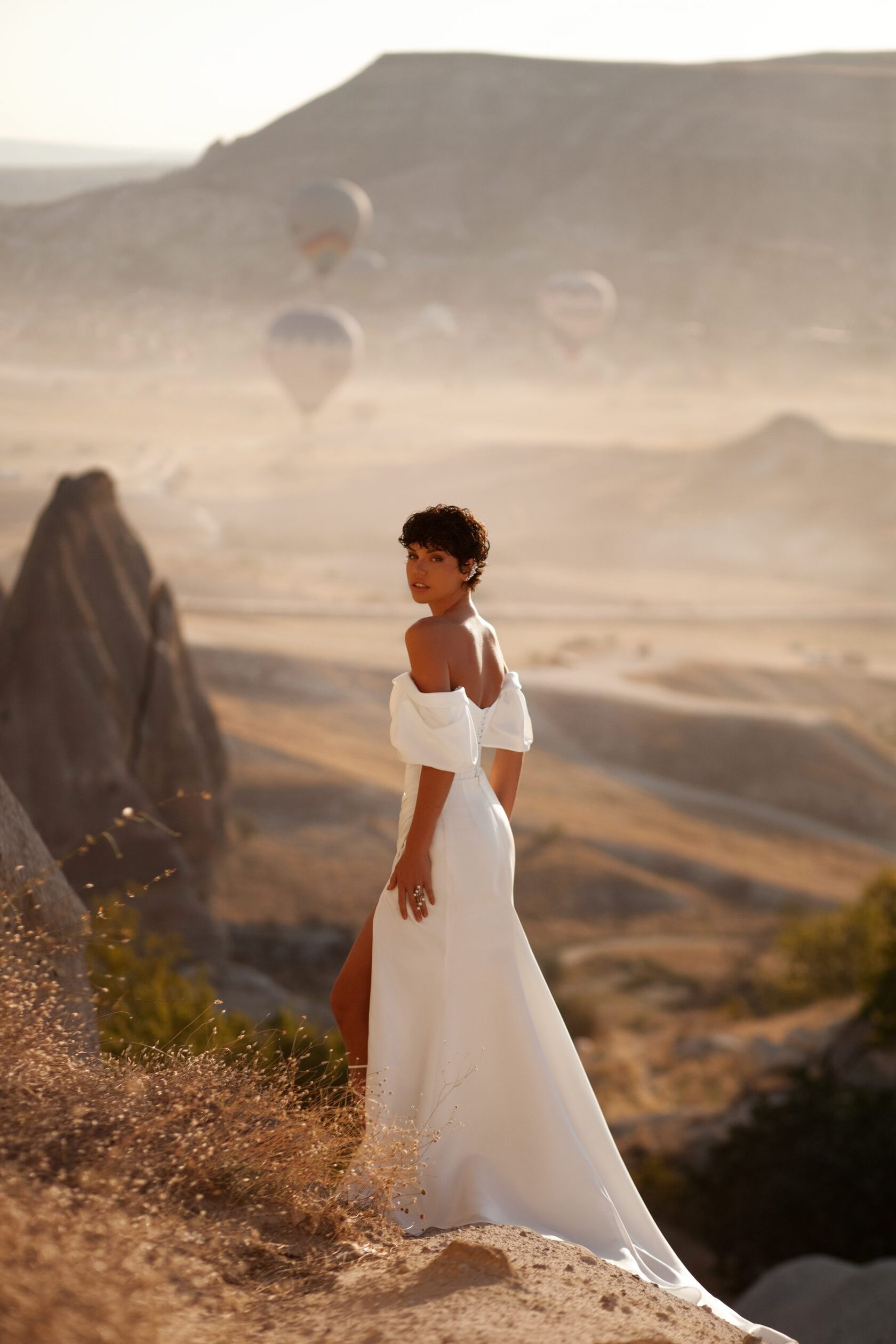 Запоминающееся свадебное платье, выполненное в прямом крое. Шарм и кинематографичность данной модели достойны места на самых пафосных голливудских дорожках. Открытые плечи и спина создают очень женственный и нежный образ.