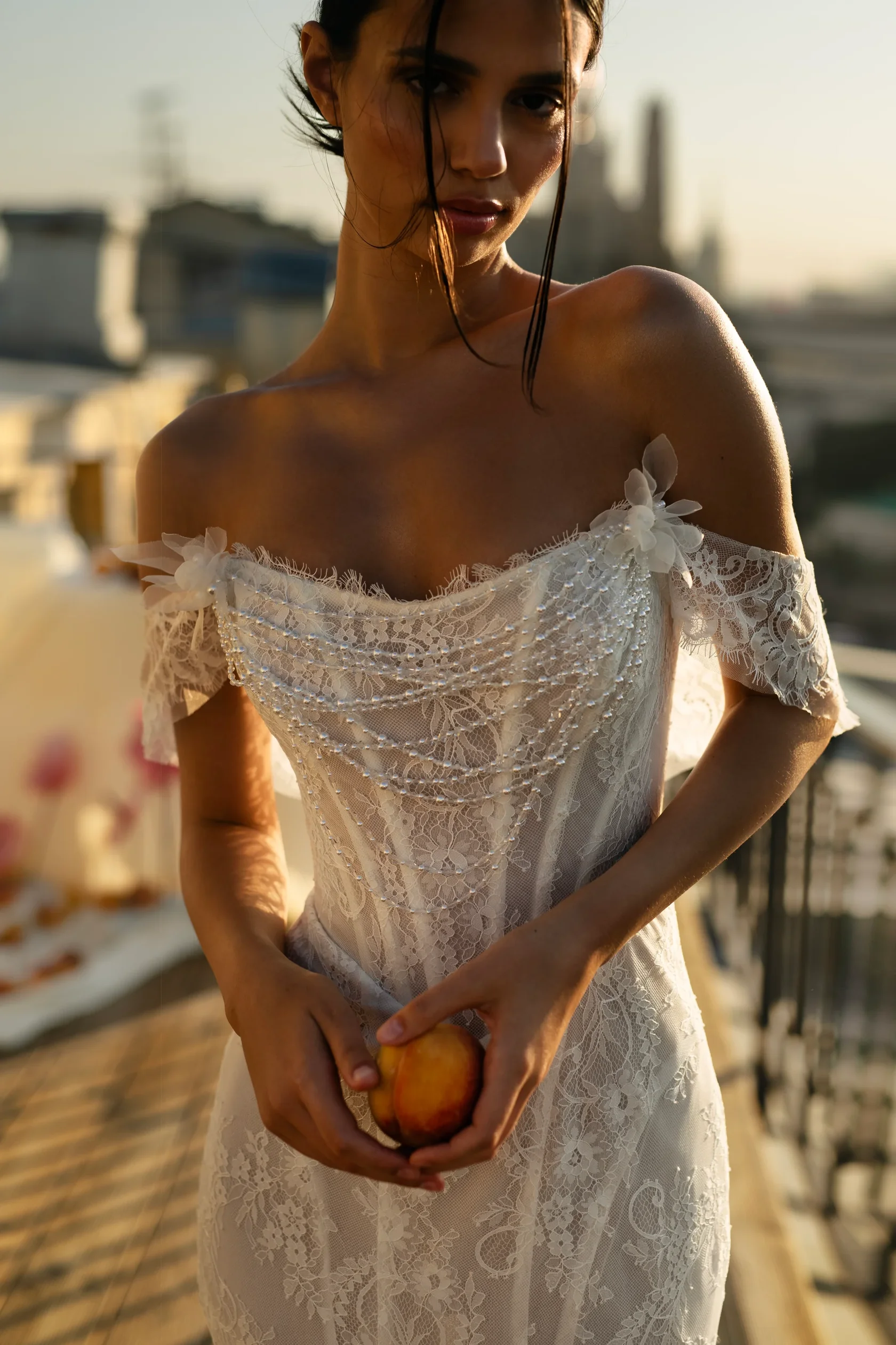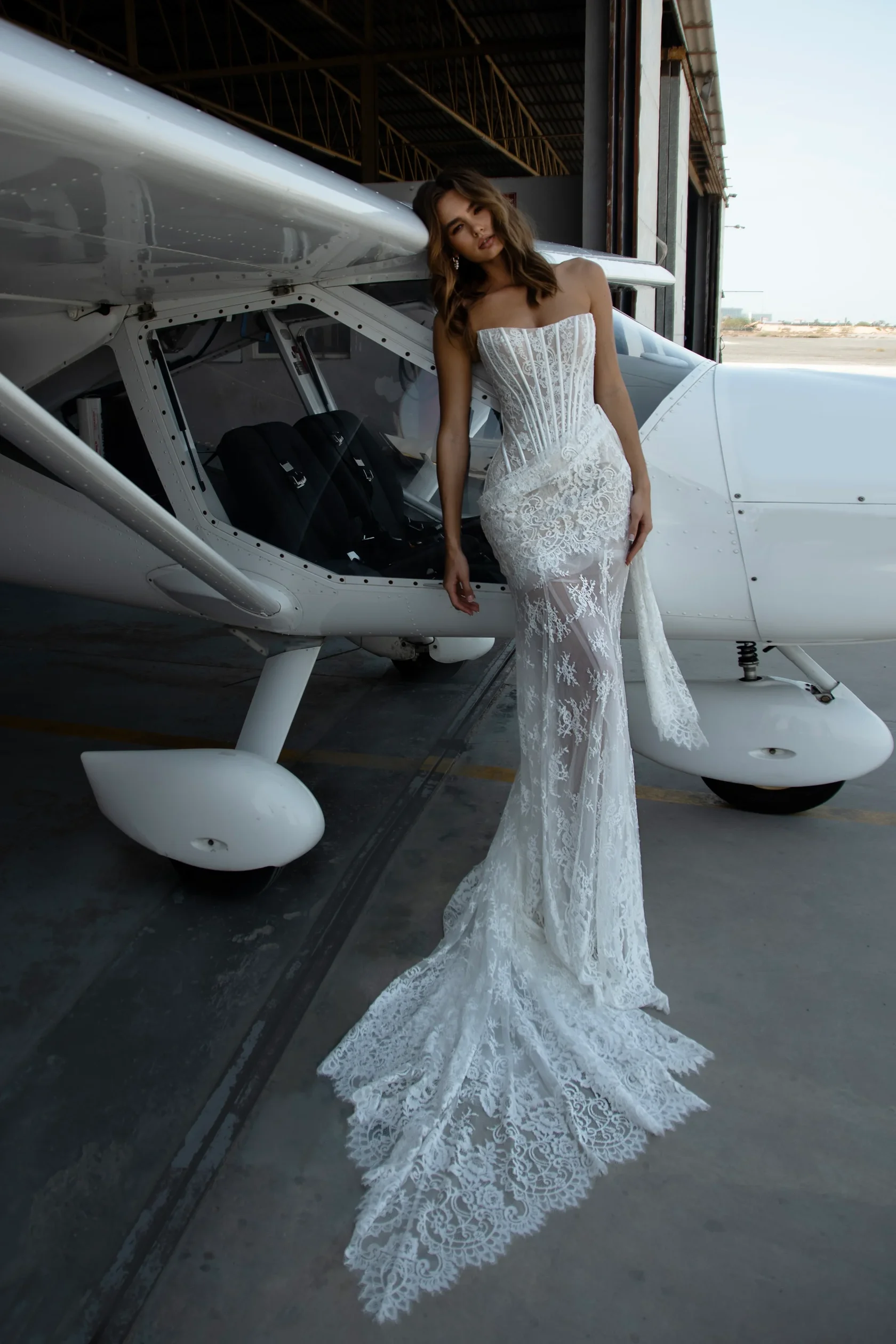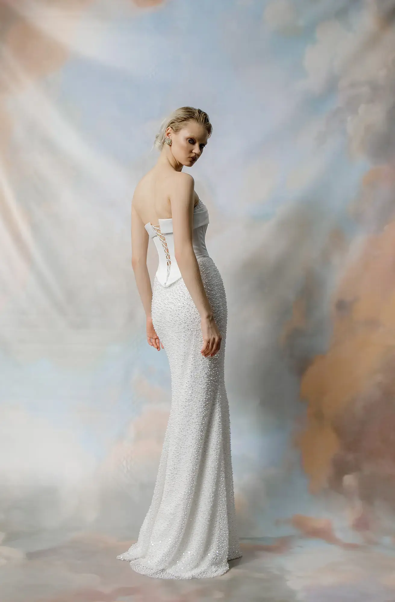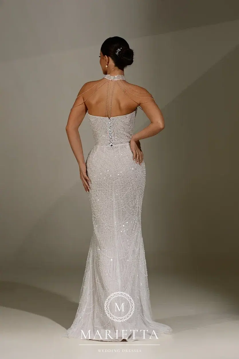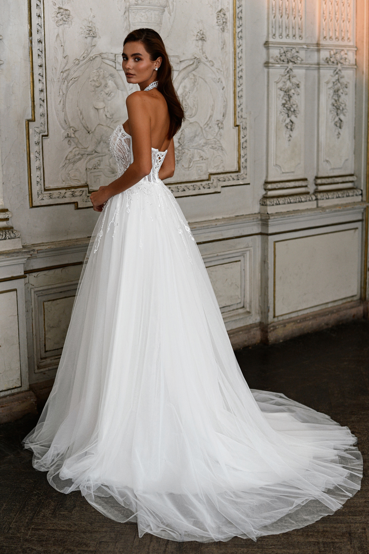 Запоминающееся свадебное платье, выполненное в прямом крое. Шарм и кинематографичность данной модели достойны места на самых пафосных голливудских дорожках. Открытые плечи и спина создают очень женственный и нежный образ.