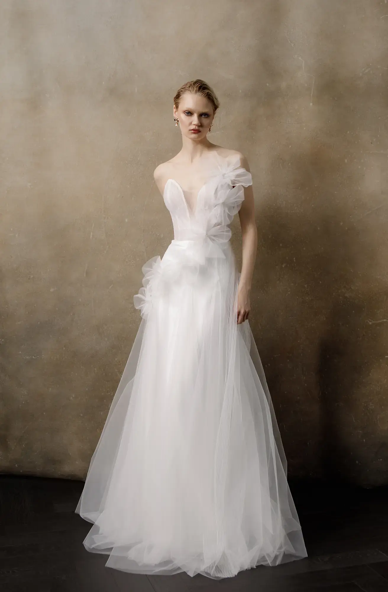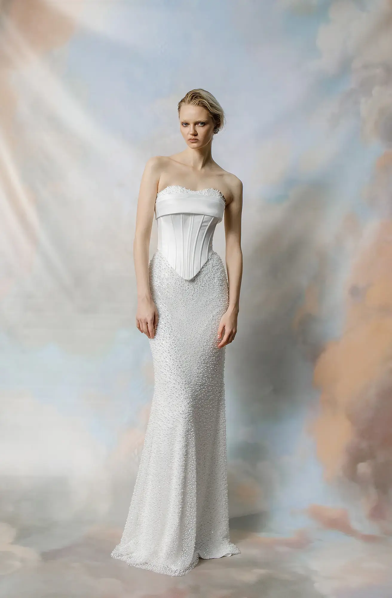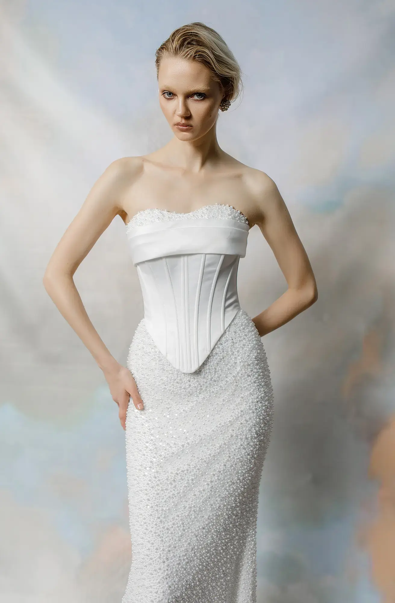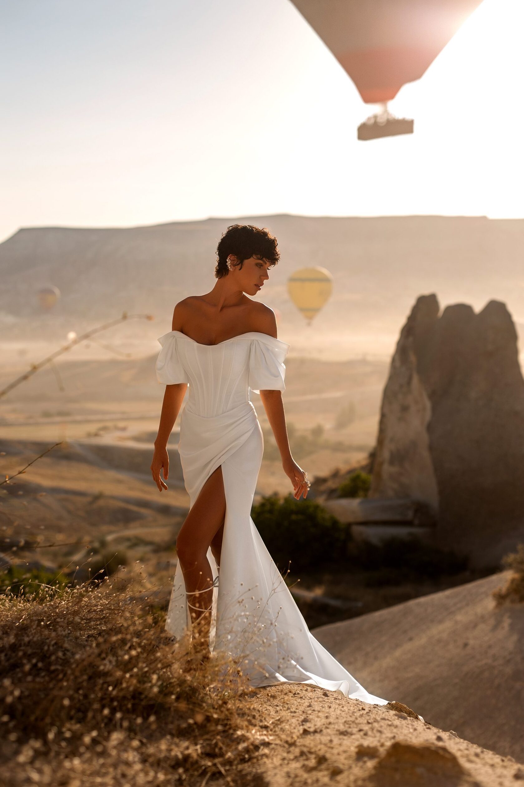 Запоминающееся свадебное платье, выполненное в прямом крое. Шарм и кинематографичность данной модели достойны места на самых пафосных голливудских дорожках. Открытые плечи и спина создают очень женственный и нежный образ.