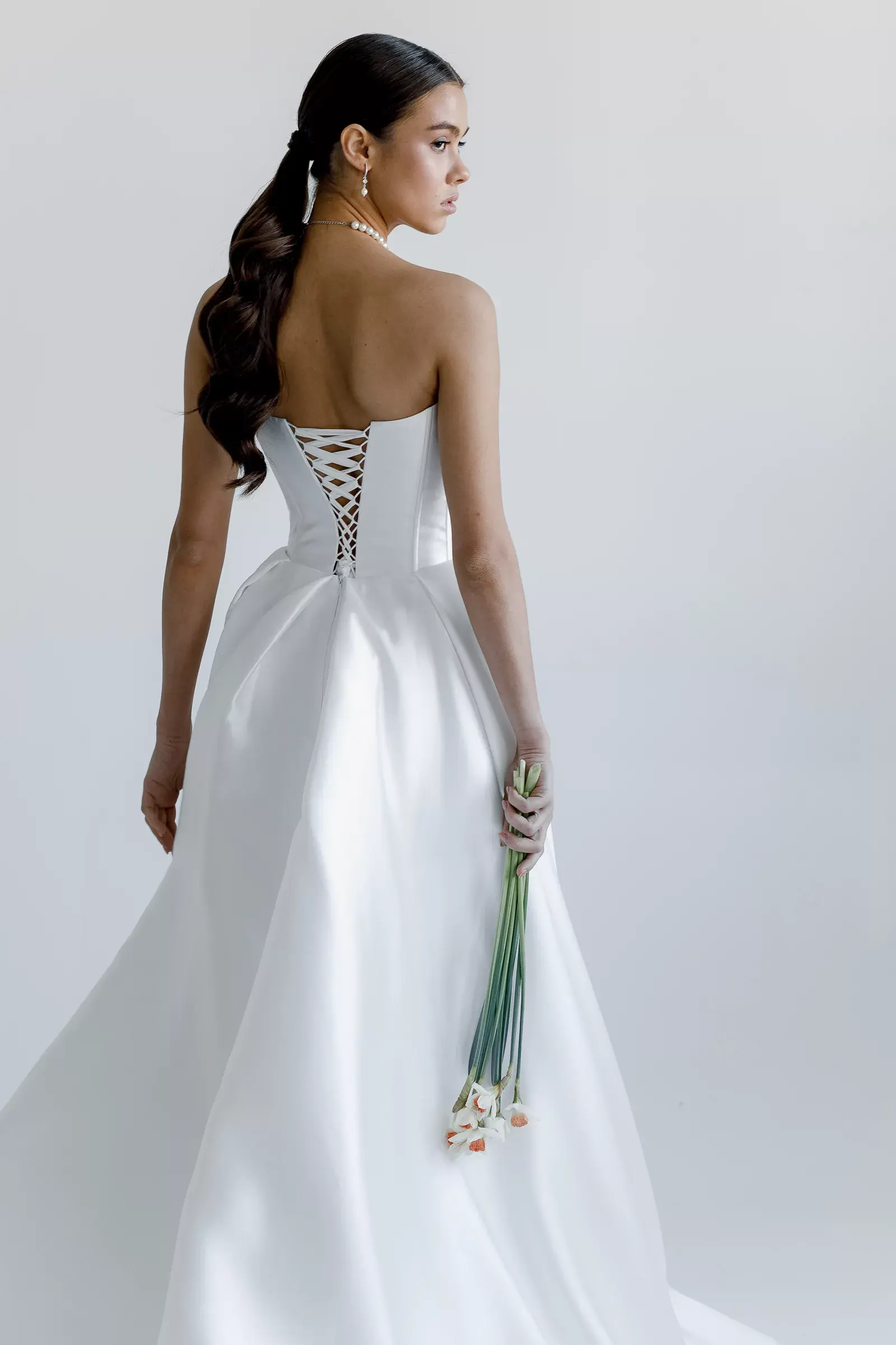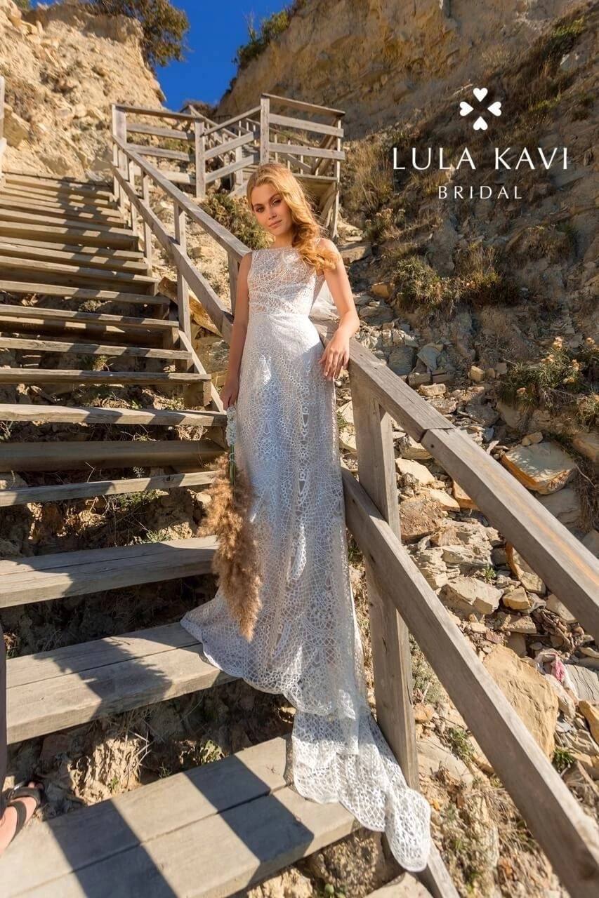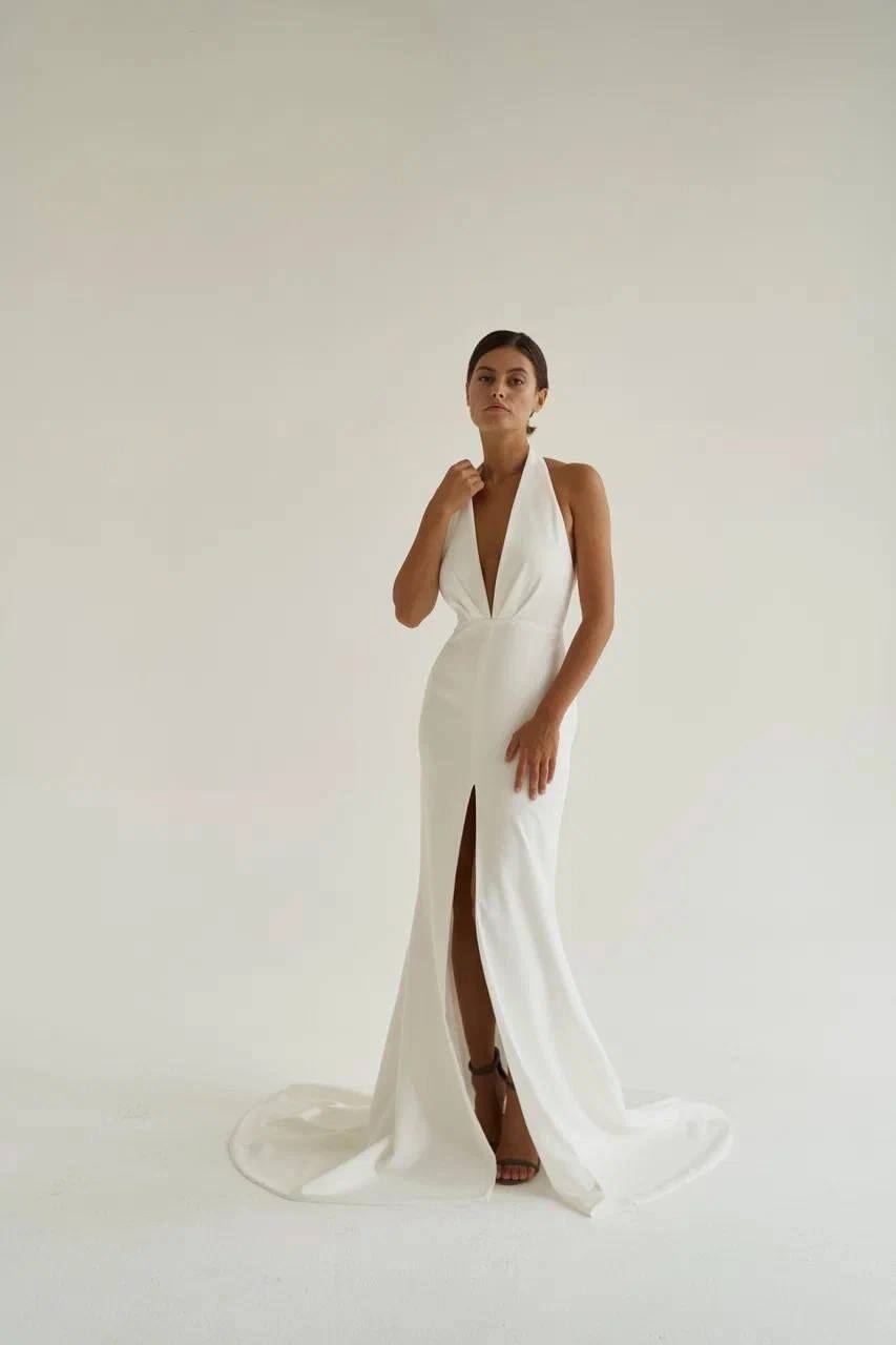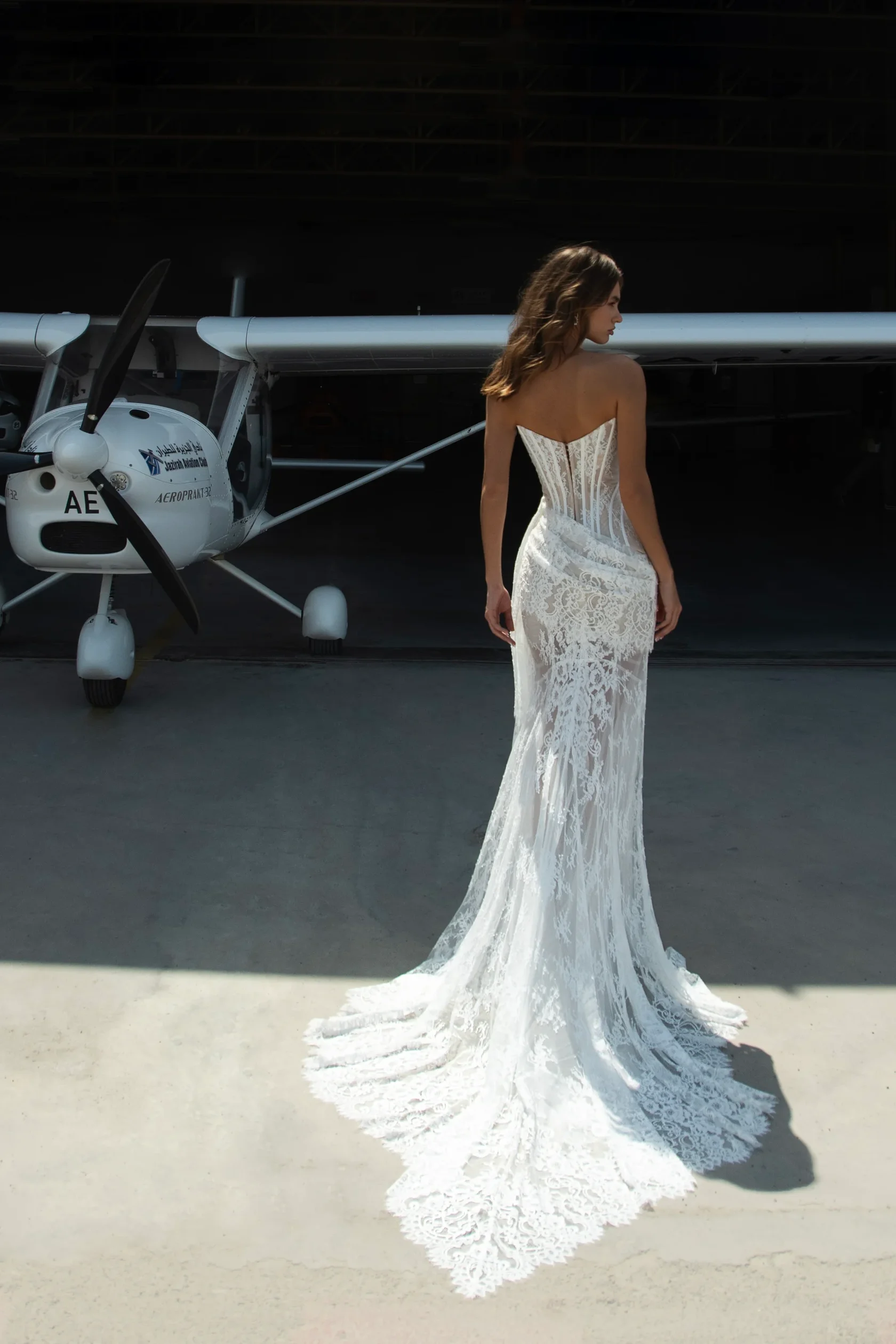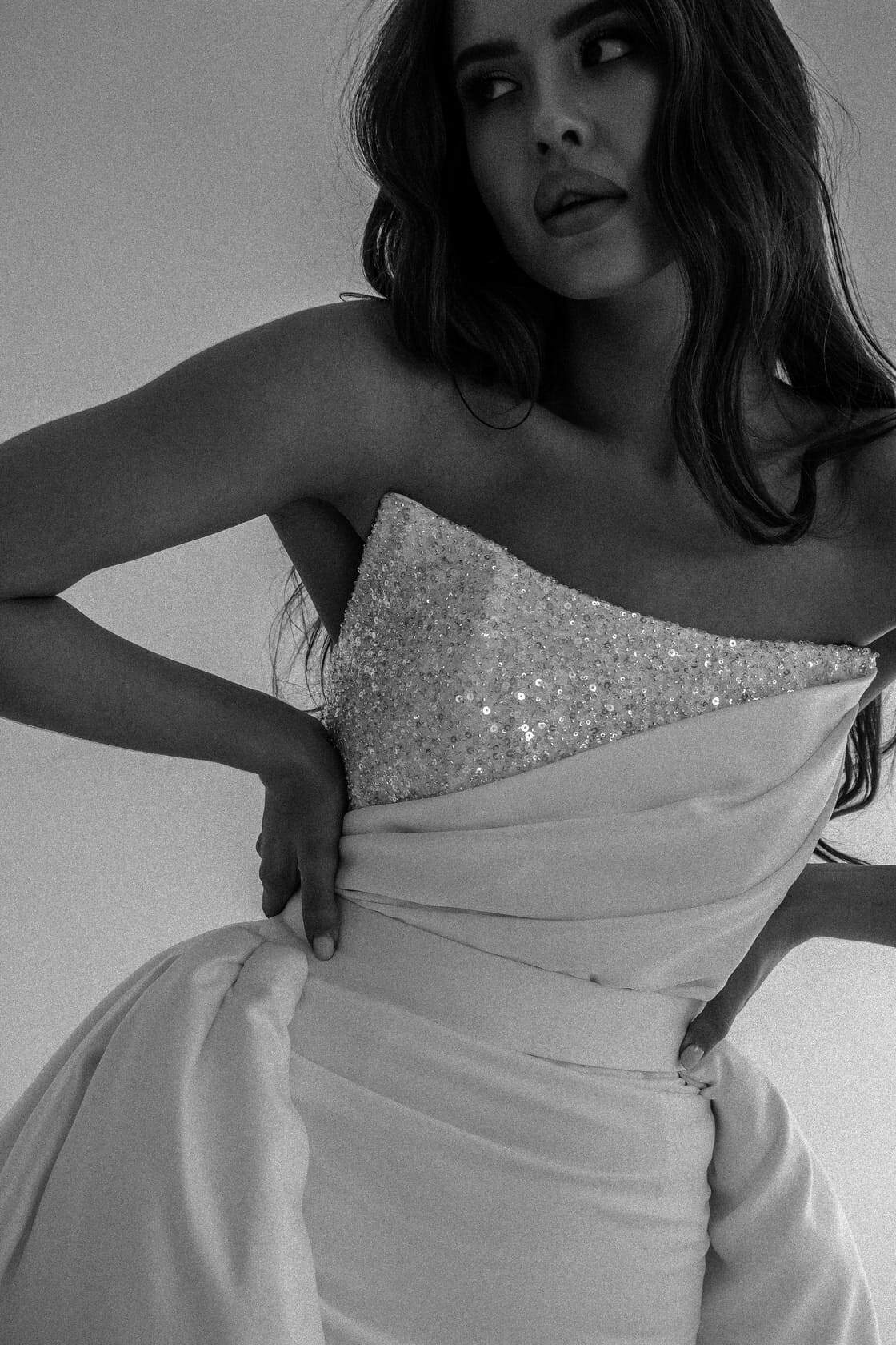 Запоминающееся свадебное платье, выполненное в прямом крое. Шарм и кинематографичность данной модели достойны места на самых пафосных голливудских дорожках. Открытые плечи и спина создают очень женственный и нежный образ.
