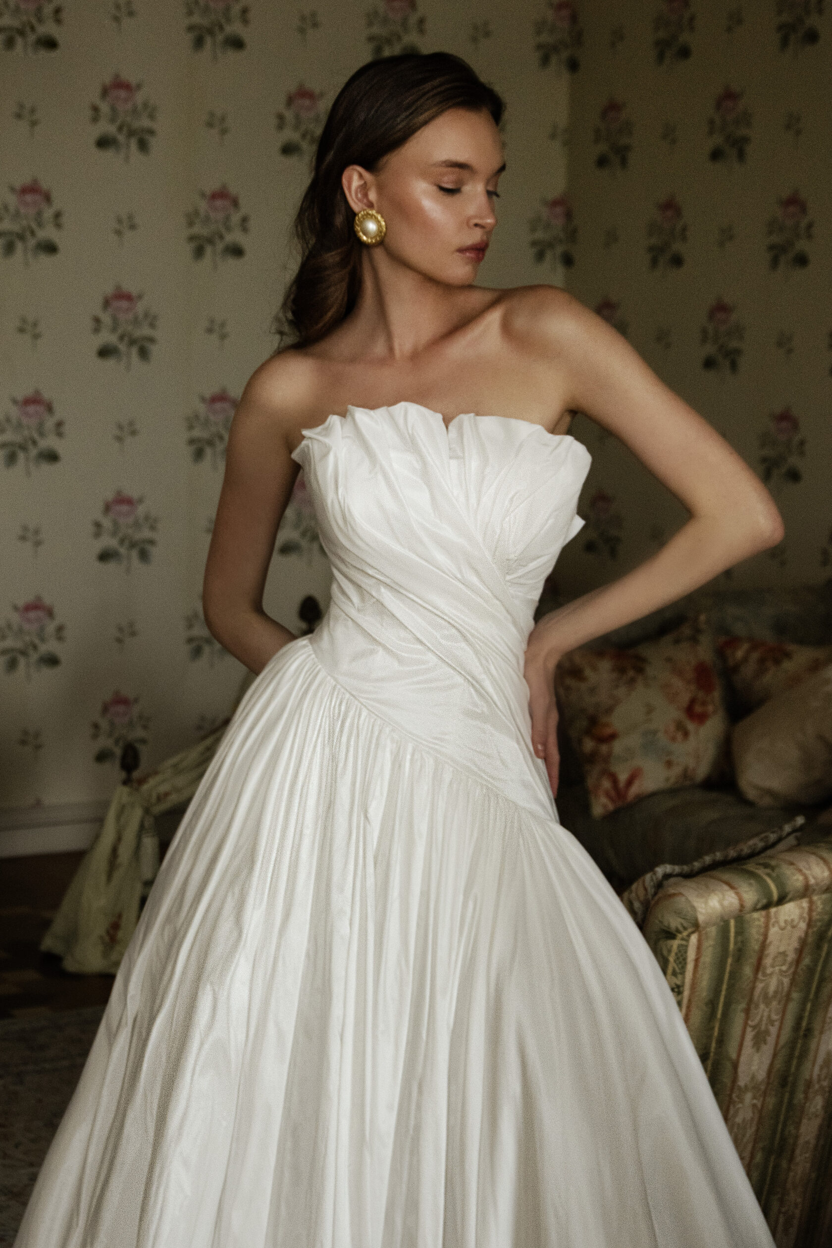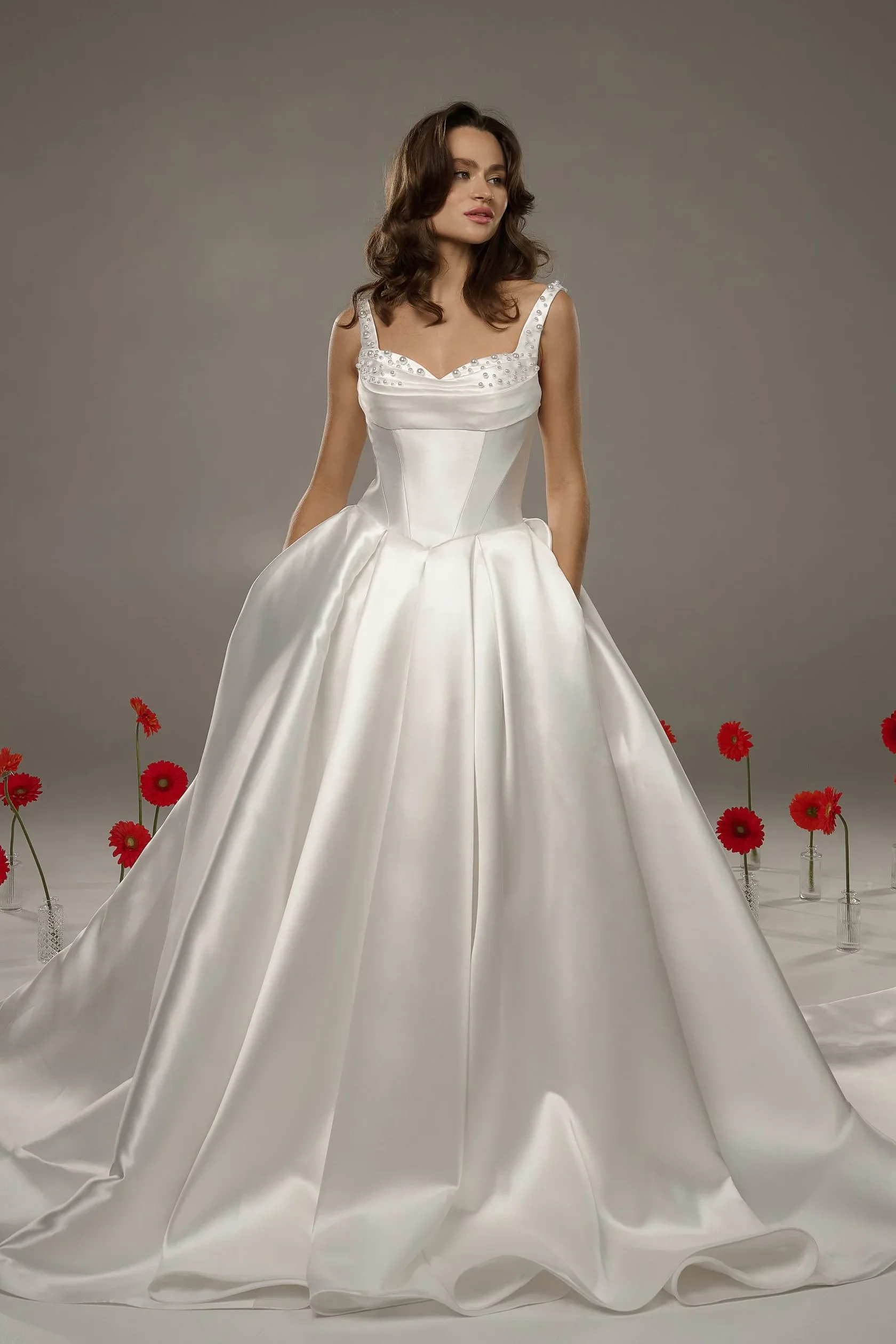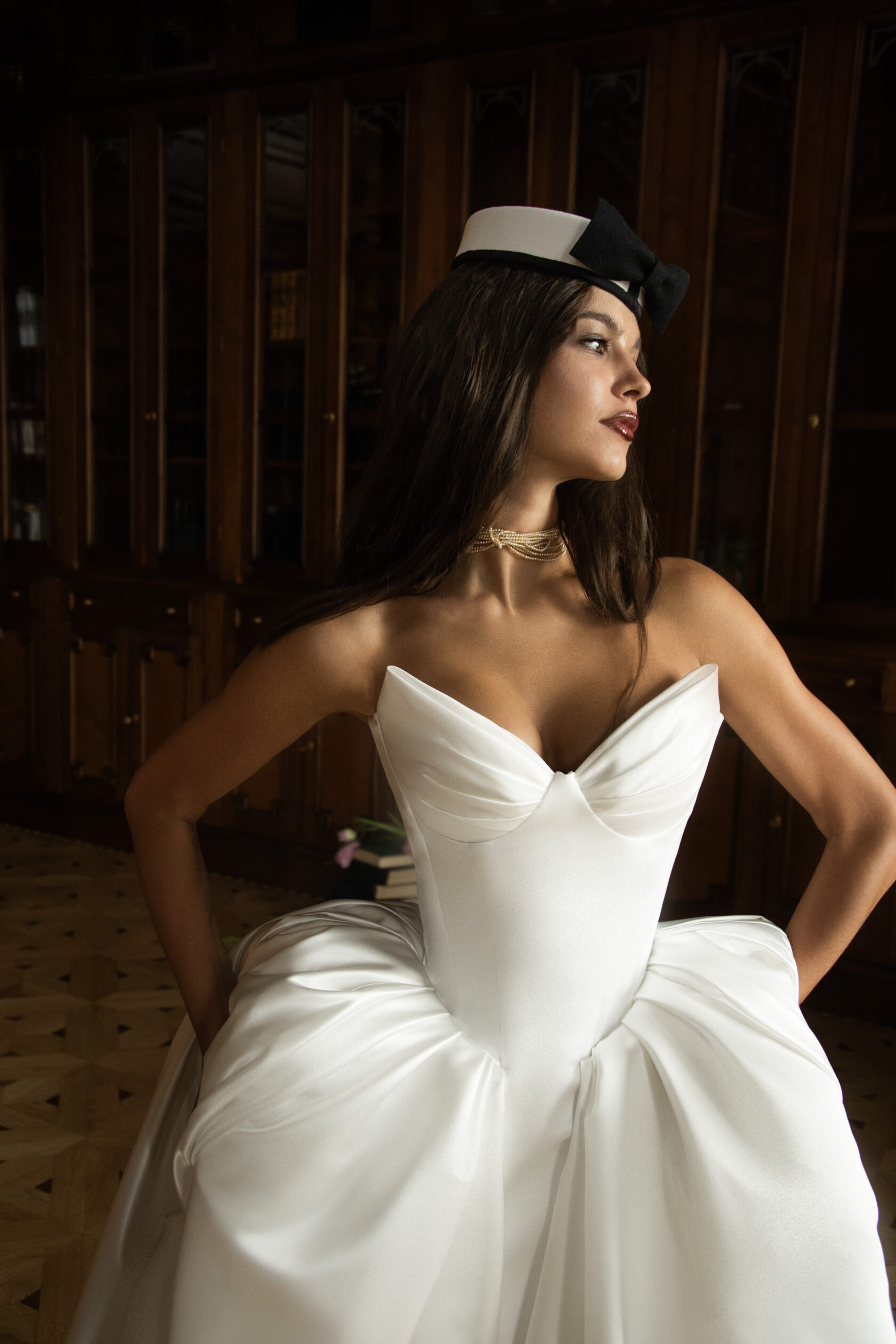Роскошное свадебное платье А-силуэта из матовой тафты со съемными буфами в виде объемных бантов. Прекрасный вариант для ярких невест, которые хотят затмить всех гостей своим необычным образом. Дополнить образ можно эффектными серьгами и подвеской.
