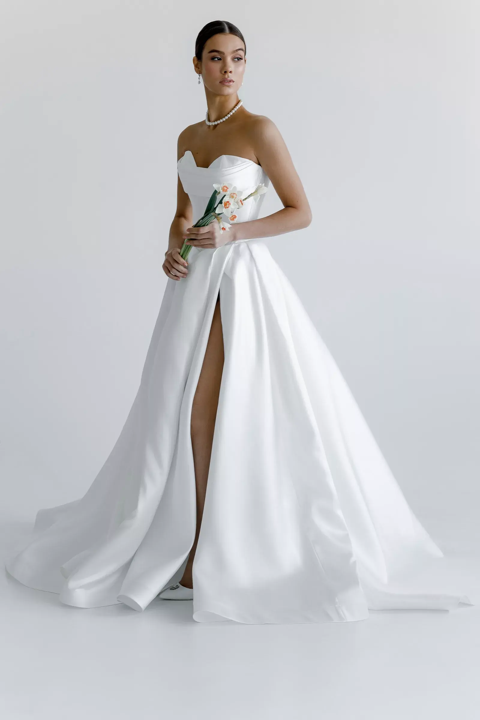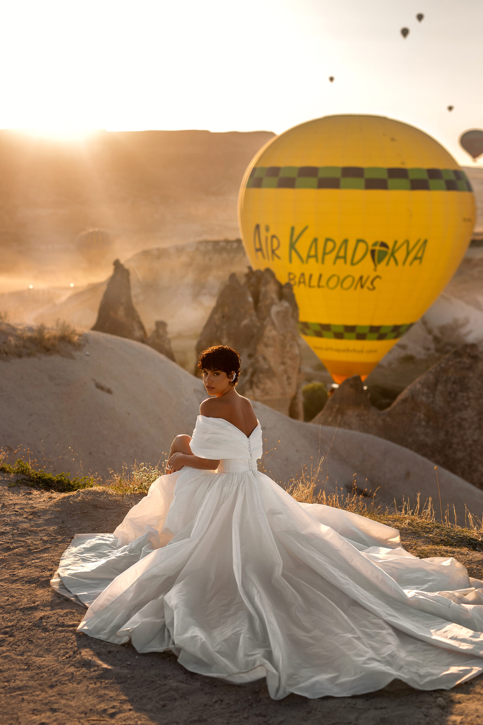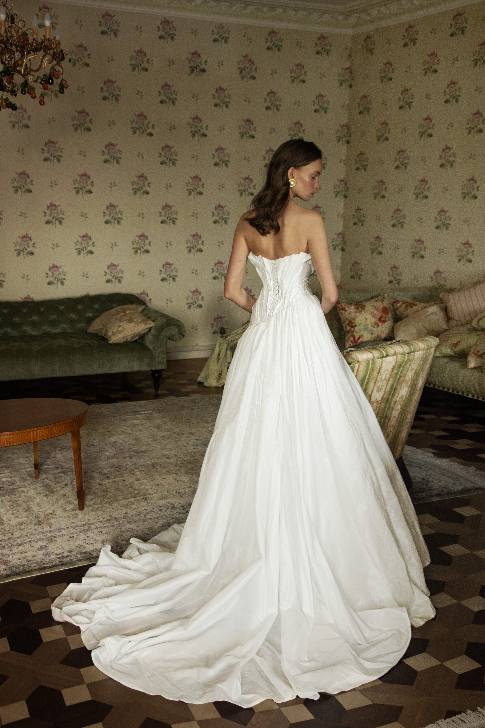 Роскошное свадебное платье А-силуэта из матовой тафты со съемными буфами в виде объемных бантов. Прекрасный вариант для ярких невест, которые хотят затмить всех гостей своим необычным образом. Дополнить образ можно эффектными серьгами и подвеской.