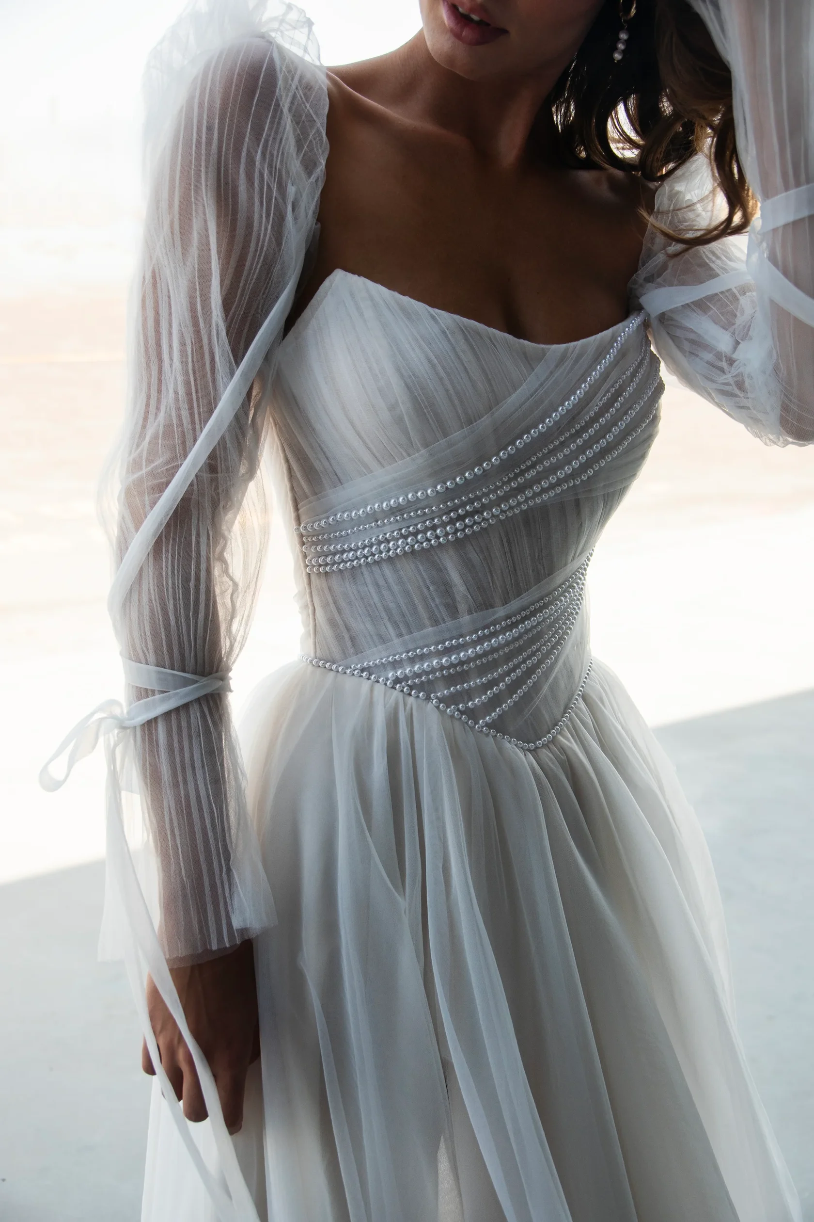 Силуэт: А-силуэт Декор: Бисер, пайетки, жемчуг Материал: Шифон Утонченное свадебное платье А-силуэта. Верх модели выполнен в классическом стиле. Корсет, с асимметричными драпировками по лифу, дополнен сияющей вставкой расшитой бисером, жемчугом и пайетками. Модель имеет длинные объемные рукава, которые можно спустить на плечи для придания образу элегантности. Юбка с эффектом запаха имеет разрез по ноге и небольшой шлейф Страна производитель: Россия