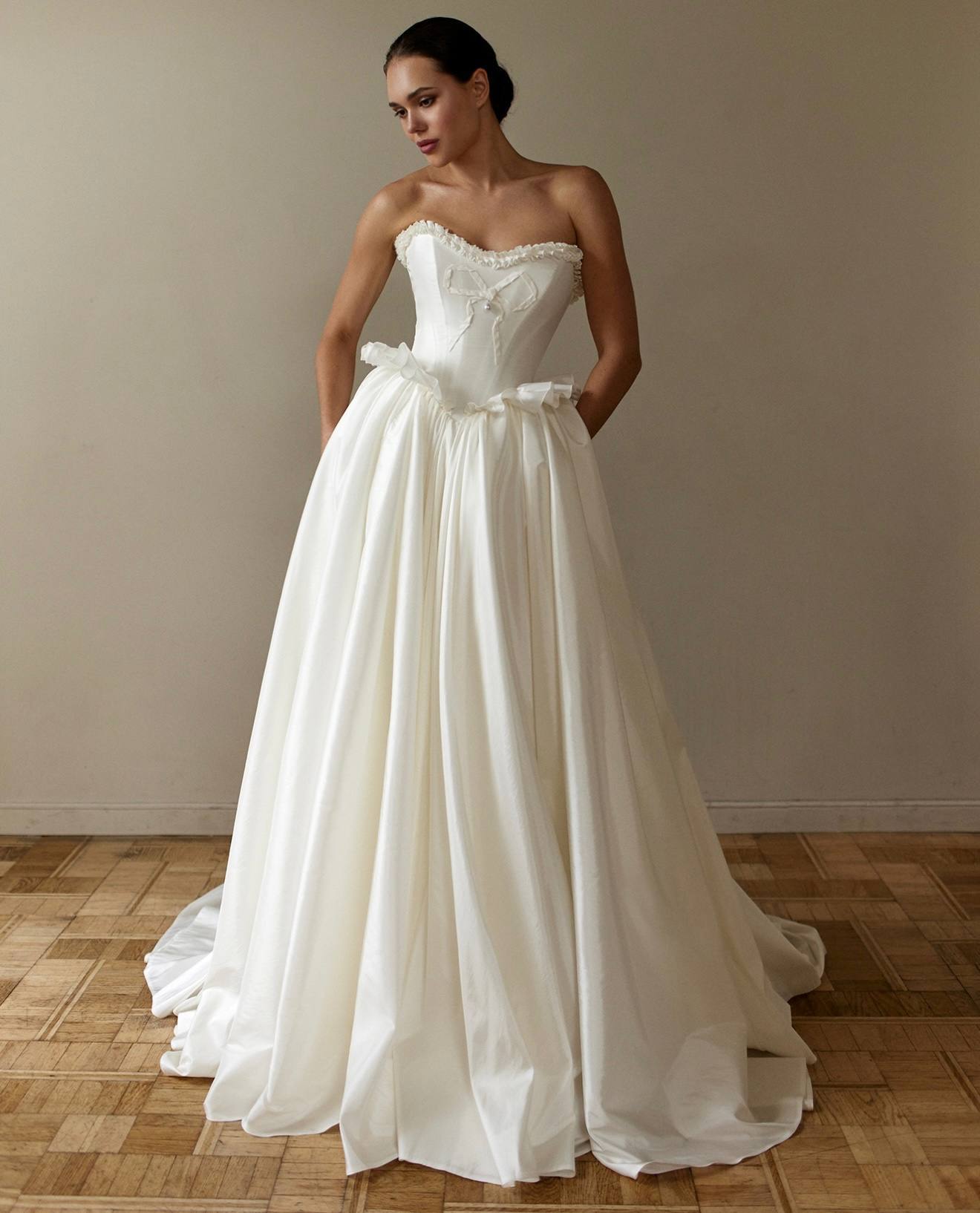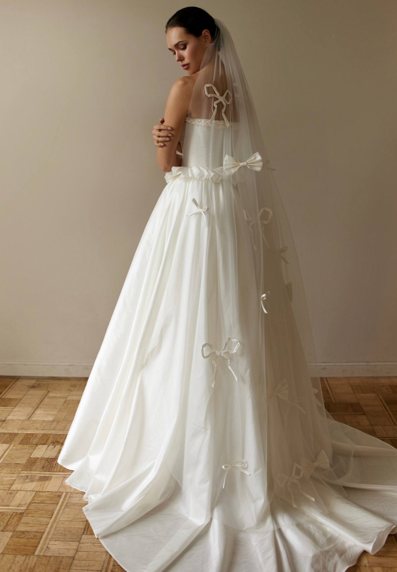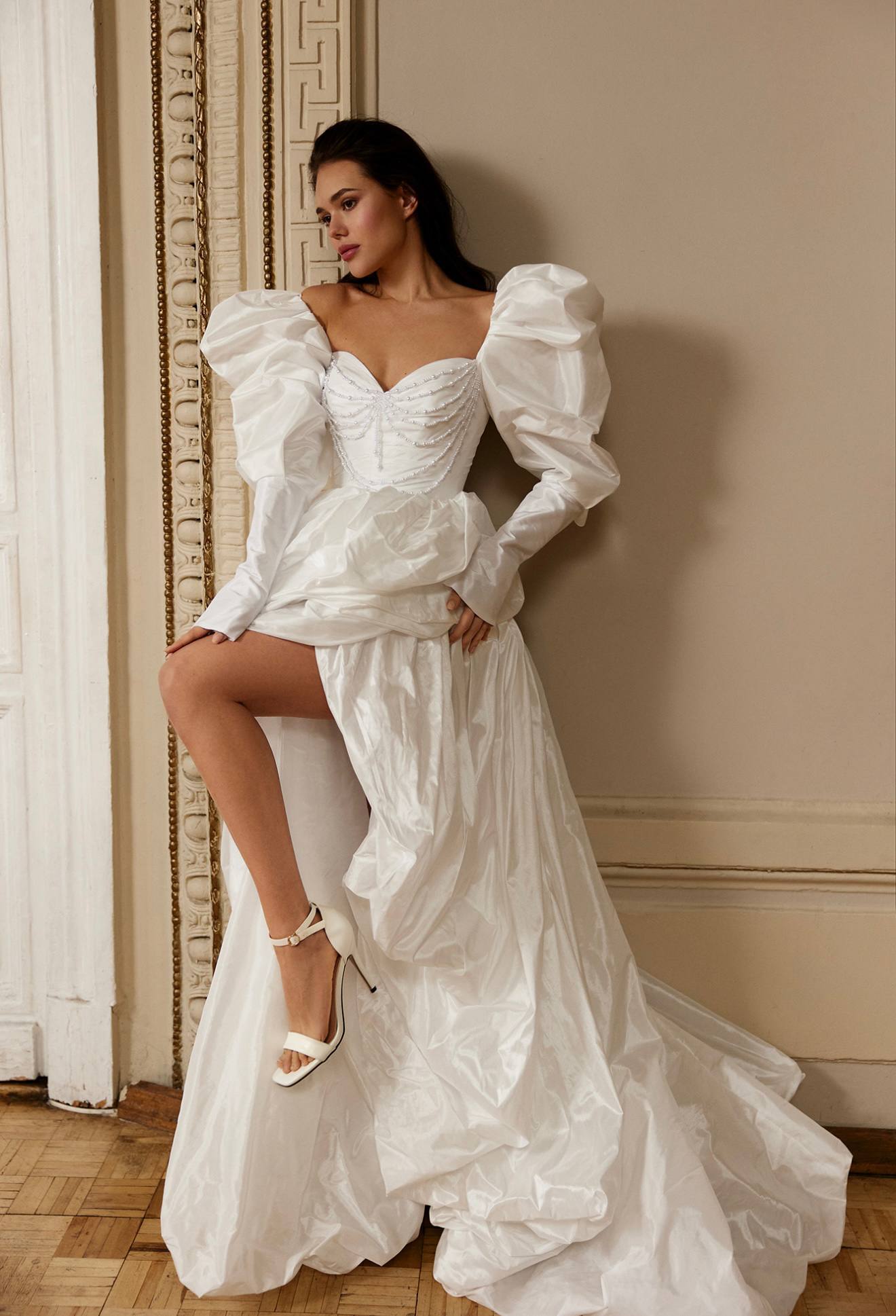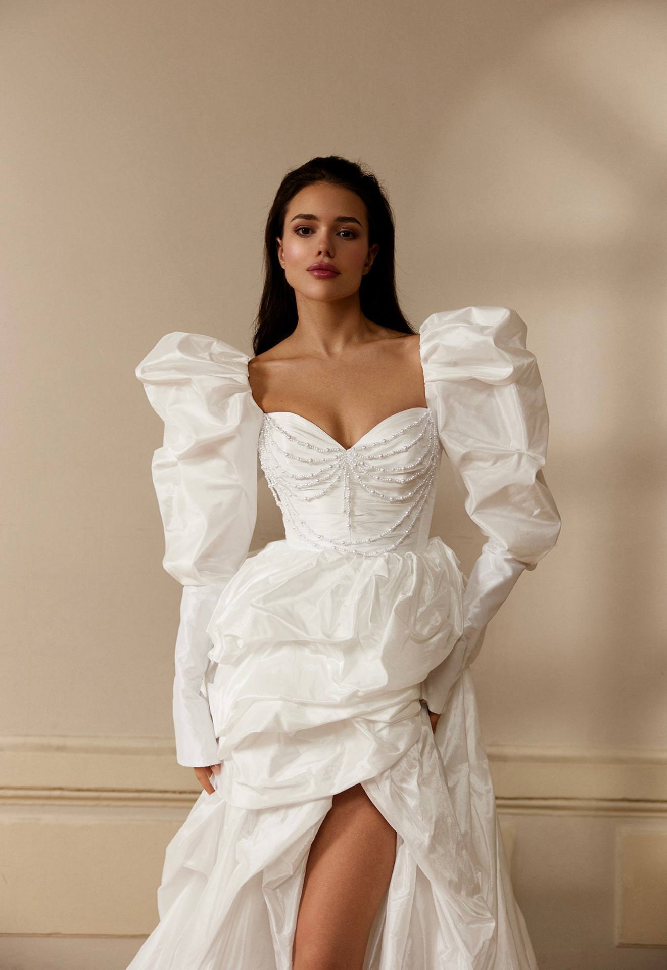 Роскошное свадебное платье А-силуэта из матовой тафты со съемными буфами в виде объемных бантов. Прекрасный вариант для ярких невест, которые хотят затмить всех гостей своим необычным образом. Дополнить образ можно эффектными серьгами и подвеской.