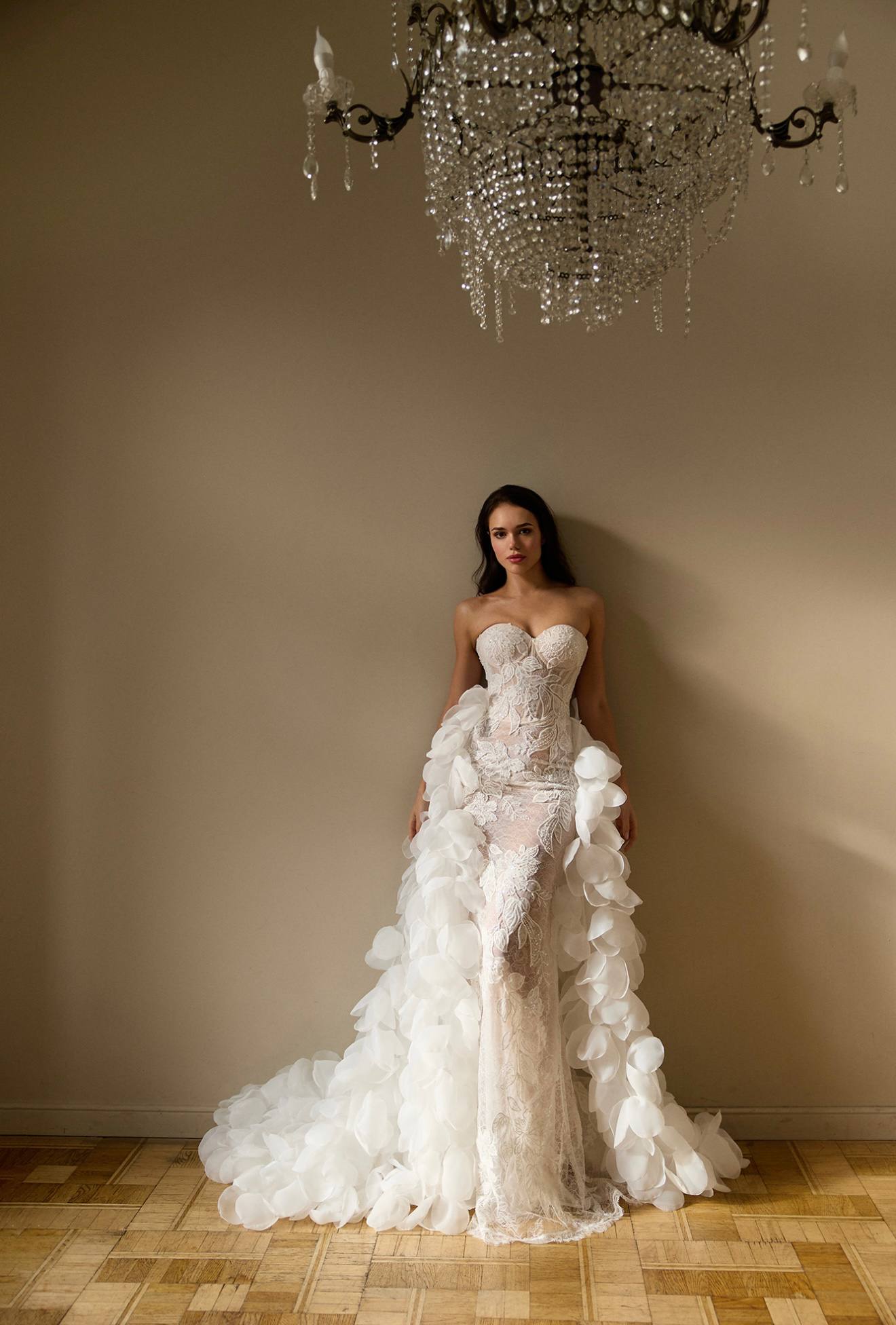 Запоминающееся свадебное платье, выполненное в прямом крое. Шарм и кинематографичность данной модели достойны места на самых пафосных голливудских дорожках. Открытые плечи и спина создают очень женственный и нежный образ.